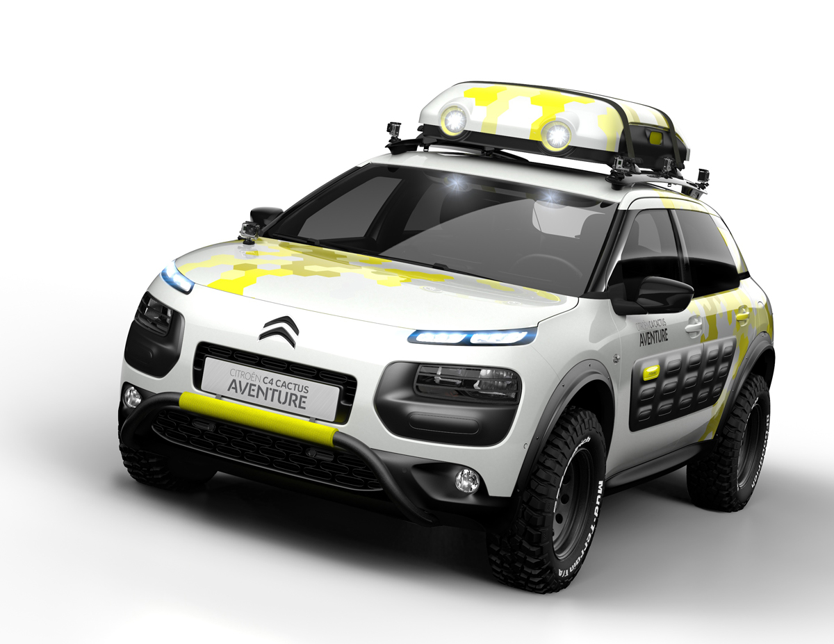 La C4 Cactus Aventure est ainsi équipée de multiples nouvelles protections pour affronter la nature sauvage : élargisseurs d’ailes, bas de caisses renforcés, barres de protection à l’avant et à l’arrière (qui apparaissent bien petites pour affronter un Tyrannosaurus Rex). Dans cette version, la C4 Cactus est plus haute de quelques centimètres et adopte de « gros boudins » et des jantes en tôle noires du plus bel effet. Les BF Goodrich Mud Terrain T/A étant plus adaptés aux chemins difficiles. Quant au coffre de toit, il est équipé de projecteurs à LED à longue portée.