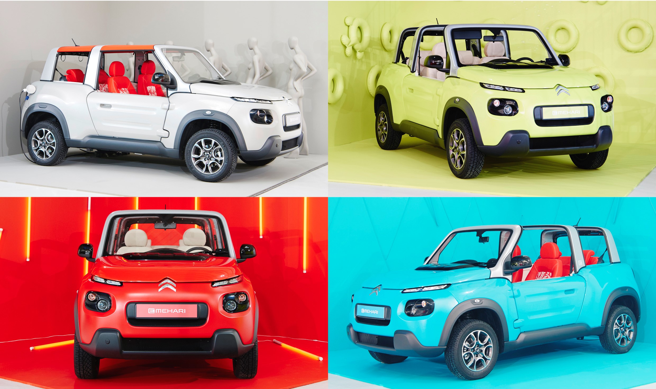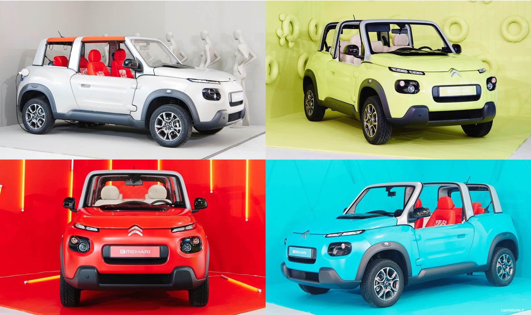 Ses 4 teintes de caisse (bleue, orange, jaune et beige), ses 2 couleurs de toiles (noire et rouge orangée) et ses 2 garnissages imperméables (beige et rouge orangé), permettront une personnalisation de celle qui devra séduire une clientèle jeune. Les 4 couleurs disponibles ont été utilisées pour créer le même nombre d’univers visuels du shooting photo baptisé Galerie E-Mehari.