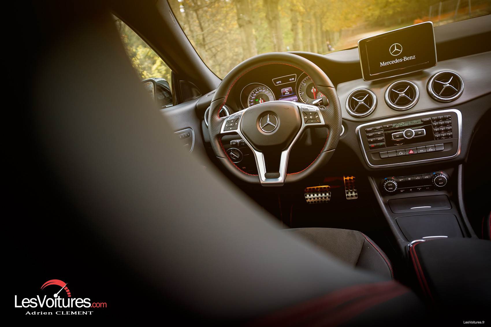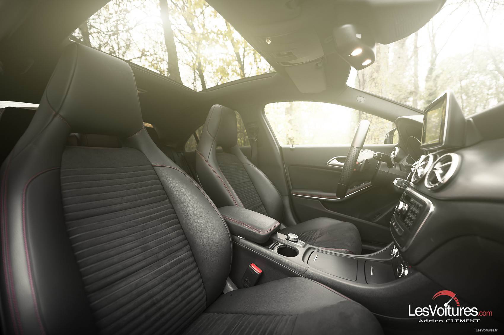 A bord, luxe et raffinement sont au rendez-vous, l’éclat des chromes et des touches d’aluminium contrastent avec le noir profond de la planche de bord. Les surpiqûres rouges marquent l’ensemble avec raffinement mais sans trop en faire, toujours dans l’équilibre. Les sièges « Sport » style baquet sont particulièrement réussis, l’assise est parfaite, la position de conduite idéale. Seul le commodo de commande de la boîte automatique à double embrayage 7G-DCT (avec palettes de commande au volant) déçoit. Placé à droite du volant, on le confondrait même avec la manette des essuie- glaces. Nous aurions préféré une grosse commande sur la console centrale. A l’arrière et puisque la Classe A est une berline à quatre portes, sachez que malgré un accès aux places délicat, dû aux lignes plongeantes de l’auto, le confort est sans égal mais plus pour deux passagers que pour trois. Les grands gabarits flirteront d’ailleurs avec le toit.
