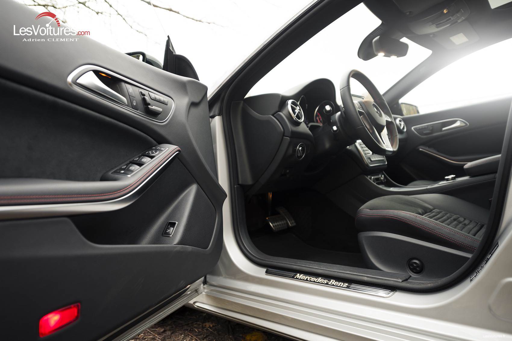 Et nous sommes pourtant en présence d’une quatre portes diesel. La liste des équipements extérieurs de la 220 CDI Fascination est impressionnante, avec principalement, la grille de calandre façon diamant, les magnifiques jantes AMG à 5 doubles branches de 18 pouces et les rétroviseurs noirs. Résultat : le design de la Classe CLA, déjà encensé pour ses formes longilignes, équilibrées et dynamiques, devient hyper sportif sans perdre l’élégance chère à la marque allemande.