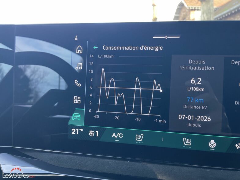 Notre Clio, encore une fois, n’a jamais roulé avec un moteur chaud ni une batterie à température optimale. Cependant, pour mesurer son potentiel réel, nous avons effectué un court trajet urbain en écoconduite poussée. La consommation est alors tombée à 4,2 l/100 km, preuve que la Clio 6 E-Tech full hybrid 160 peut être très sobre dès que les conditions s’améliorent.