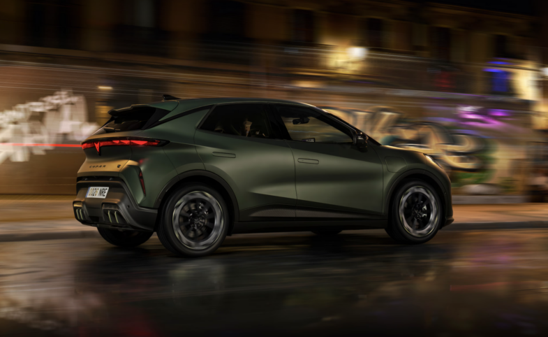 Le profil de la Cupra Raval, pensé comme un casque, accentue la dynamique générale grâce à une ligne de vitrage ascendante, des flancs sculptés et des jantes pouvant atteindre 19 pouces. Les poignées affleurantes, le béquet de toit et le diffuseur massif témoignent d’un travail poussé sur l’aérodynamisme. Cupra affirme d’ailleurs que la Raval affiche le meilleur coefficient aérodynamique de toute sa gamme. À l’arrière, un bandeau lumineux intégrant un logo éclairé relie des optiques fines étirées sur des ailes puissamment galbées.