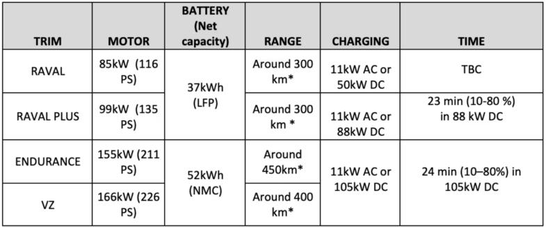 Le lancement officiel de la Cupra Raval interviendra à l’été 2026, avec quatre versions exclusivement traction. Les variantes de 116 ch et 135 ch utiliseront une batterie LFP de 37 kWh utiles de capacité, pour environ 300 km d’autonomie. Les versions plus puissantes, 211 ch et 226 ch, seront associées à une batterie NMC de 52 kWh utiles, offrant 400 à 450 km d’autonomie. En termes de recharge, toutes les versions de la Raval disposent d’un chargeur embarqué 11 kW AC. Les modèles 37 kWh acceptent la charge rapide 50 kW pour le modèle de 116 ch ou 88 kW, pour la version de 135 ch, permettant un passage de 10 à 80 % en 23 min. Les versions équipées de la batterie de 52 kWh de capacité montent à une puissance de 105 kW DC, avec un 10 à 80 % communiqué en 24 min par Cupra.
