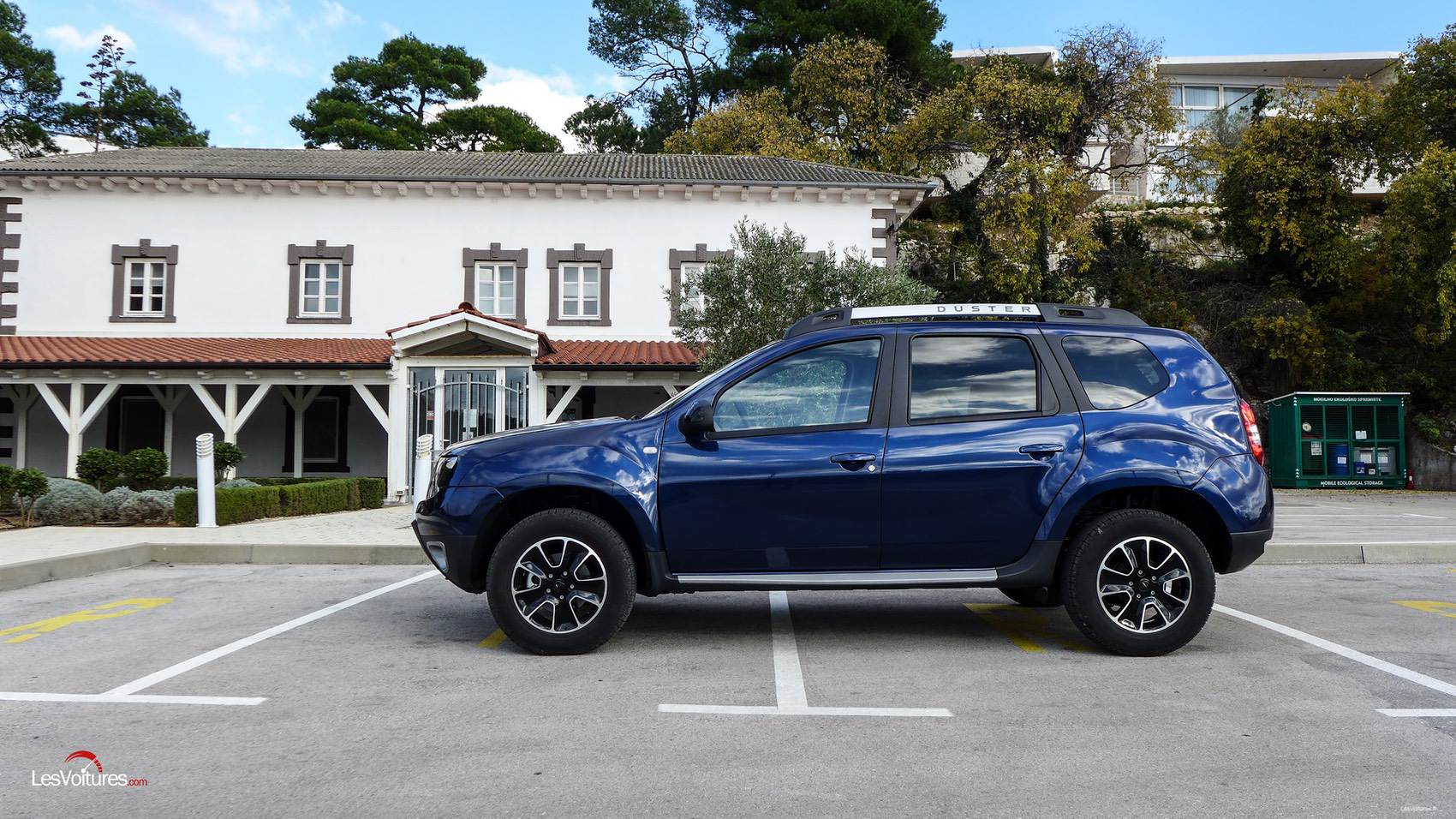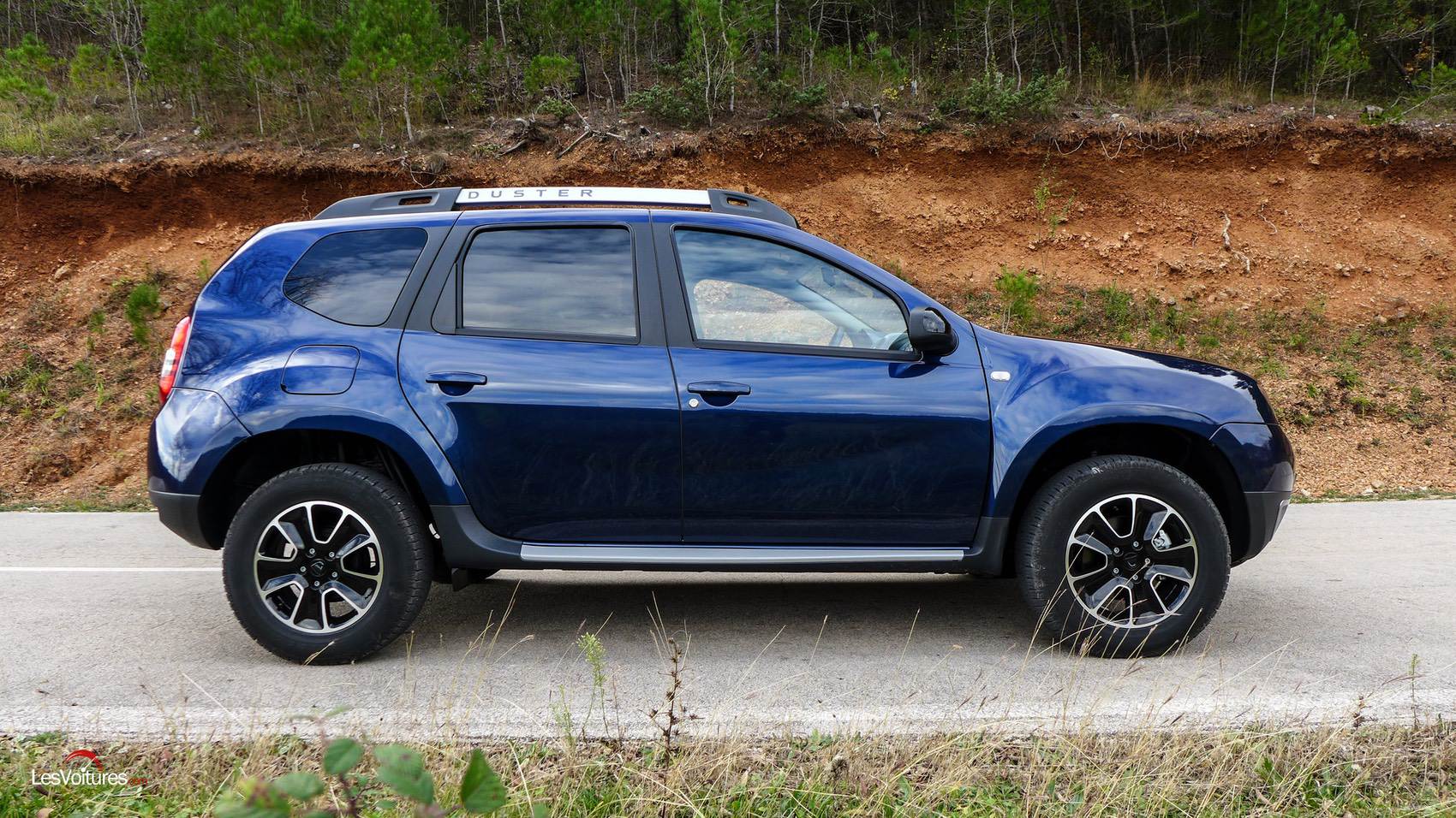 Dans cette version, le Duster est joliment campé sur des jantes en alliage 16″ noires diamantées. Cette teinte est également présente de manière plus sombre sur les montants des portes. Pour parfaire le travail visuel, des barres de toit au ton chrome satiné (identique au cerclages des antibrouillards) ornent le SUV. A noter que la belle teinte Bleu Cosmos de notre modèle d’essai est hélas en option (480 €).