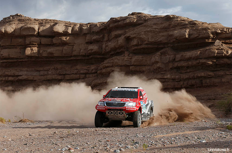 Sur ses terres d’Argentine, Terranova termine 1 mn 54 s devant Giniel de Villiers (Toyota Hilux #303), déjà second hier. Et c’est encore une Toyota Hilux, la #325, qui se hisse sur la 3èma marche de l’étape du jour (284 km de Spéciale). Les Peugeot 2008 DKR progressent de jour en jour avec Carlos Sainz (#304) qui se classe 4ème à 4 mn 06 s devant Nasser Al-Attiyah (MINI All4 Racing #301).
