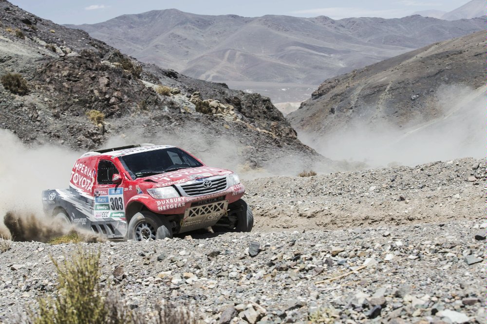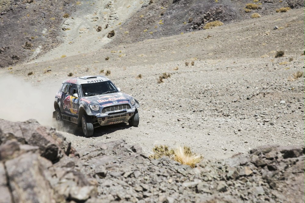 Il n’a fallu que 3h09’18 à Al-Attiyah pour parcourir les 315 km de la Spéciale. Hyper régulier, Giniel De Villiers (Toyota Hilux #303) maintient la pression sur la MINI All4 Racing de tête en terminant 3ème à 2 mn 57 s. Dans le coup pour la victoire jusqu’aux derniers kilomètres, Stéphane Peterhansel (Peugeot 2008 DKR #302) se classe 5ème derrière Yazeed Alrajhi (Toyota Hilux #325). Un peu trop optimiste sur un saut en début de parcours, endommageant son châssis, Peterhansel a ensuite crevé avant de finir l’étape à faible allure. Hélas pour Carlos Sainz (Peugeot 2008 DKR #304), il est resté bloqué de très longues heures à cause d’un problème mécanique après seulement 30 kilomètres et perd toute chance au général. A l’heure où nous publions le classement il est toujours arrêté auprès de son camion d’assistance. Quant à Cyril Despres, (Peugeot 2008 DKR #322), il a également rencontré de gros soucis mécaniques mais il devrait pouvoir relier l’arrivée. Les 2008 DKR sont donc compétitives mais elle souffrent de leurs jeunesses.