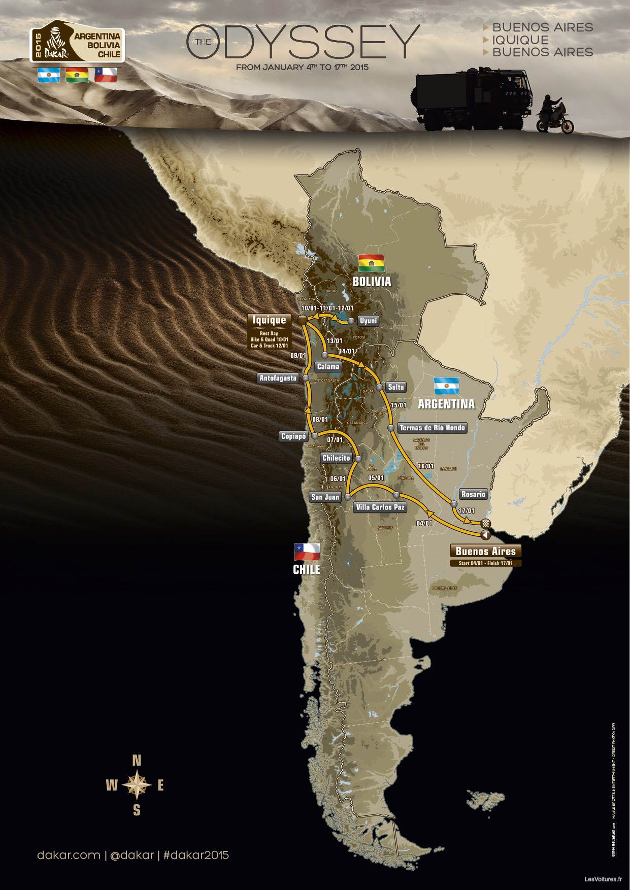 Le Dakar 2015 s’élancera demain pour un parcours de plus de 9 000 km à travers l’Argentine, le Chili et la Bolivie. 13 étapes sont au programme de cette 37ème édition qui voit le retour de Peugeot, 25 ans après sa dernière victoire.