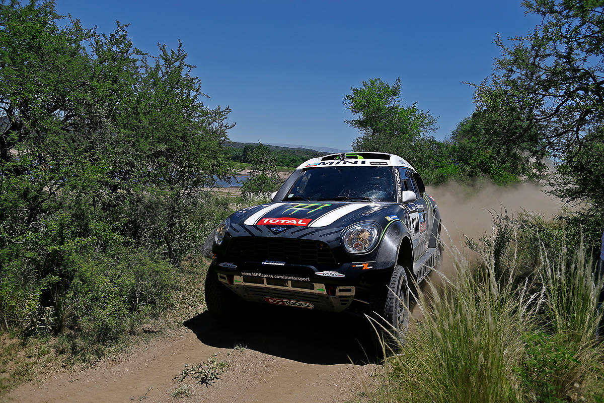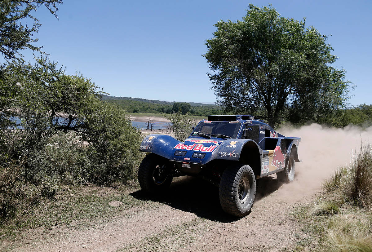 Le vainqueur en titre du Dakar, Stéphane Peterhansel, accuse 4 minutes de retard suite à une crevaison sur la MINI #300. Carlos Sainz (#303 SMG Red Bull) parfois peu à l’aise sur les pistes étroites avec son buggy est quand même 5ème.