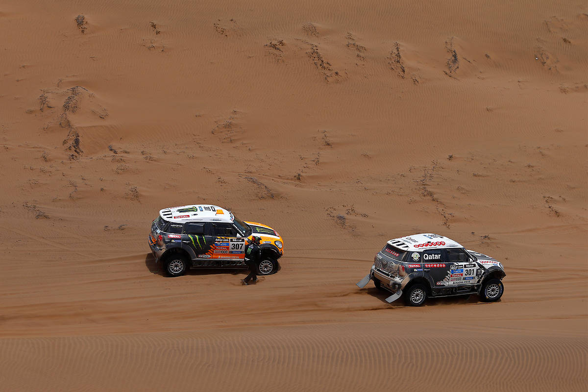 Premier à s’élancer ce matin, Orlando Terranova (MINI All4 #307) s’est une nouvelle fois planté dans une dune et à donc lâcher de nombreuses minutes (photo ci-dessous). Sur ses talons, Nani Roma (MINI All4 #304) a lui souffert d’une crevaison dès le début de la spéciale, et s’est vu rapidement rejoindre par Nasser Al-Attiyah (MINI All4 #301), puis Stéphane Peterhansel (MINI All4 #300). Roulant derrière le leader du général, le tenant du titre va toutefois passer devant, après que Roma ne se soit à son tour planté dans le sable, mais très peu de temps. Voyant la MINI All4 jaune du leader revenir dans ses rétroviseurs, Peterhansel s’efface alors pour laisser passer son ami catalan. Mais Roma n’en fait rien, et préfère suivre « Monsieur Dakar » dans tout le passage de dunes, avant de finalement le doubler à 500 m de l’arrivée. Insuffisant toutefois pour remporter l’étape, ni surtout conserver le pouvoir au général.