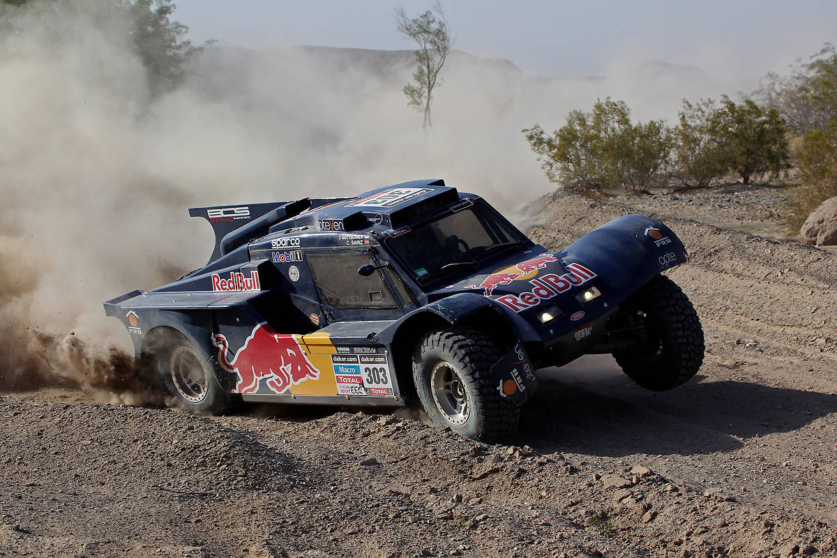Après la victoire surprise de Sousa à bord de son 4×4 chinois Haval (#306) lors de la première étape, les MINI All4 du Team X-Raid de Peterhansel (#300) et Roma (#304) avaient remporté les deux autres étapes ! Aujourd’hui, c’est Carlos Sainz et son buggy Red Bull SMG (#303) qui ont réalisé le meilleur temps d’une très longue Spéciale de 657 km entre San Juan et Chilecito (liaison : 210 km).