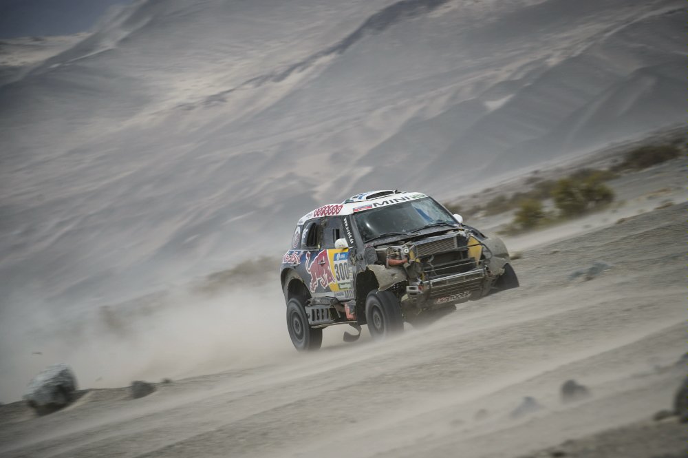 Quant à Sébastien Loeb (Peugeot 2008 DKR #314), il se classe 5ème à 17 mins 40 s de Peterhansel. C’est une sacré performance, car Loeb a également connu des galères aujourd’hui avec un tonneau, deux crevaisons et un ensablement. Voici son récit du jour : « Pas grand-chose de bon. Je dois m’habituer à ça. Pour l’instant ça ne m’amuse pas trop de taper de partout. C’était difficile, compliqué à tous les niveaux. On suivait de la trace. Pour ceux qui étaient devant ça devait être vraiment dur. On est toujours à la limite de s’ensabler. On essaye d’avancer. . La fin était plus sympa avec quelques dunes. On a dû perdre 10′ en cherchant un way-point. . On laisse en tout 15 à 20′ sur l’étape. Mais les autres ont dû chercher aussi ce way-point. En fait on valide un way-point qui est le suivant en croyant logiquement que c’est celui qui précède. Du coup tu le cherche. Les routes des 2 way -points doivent être trop proches. On fait un petit tonneau aussi sur un kicking dans une dune. On fait toute la spéciale en mode dégradé dans le sable mou… En dehors de ça on arrive au bout ! 2 crevaisons, 1 tonneau, 1 ensablement, à un moment paumés… » Place au résumé vidéo de l’étape 10. A noter que de nouveau, le parcours de la Spéciale a été raccourci suite aux forts orages de la nuit précédente.