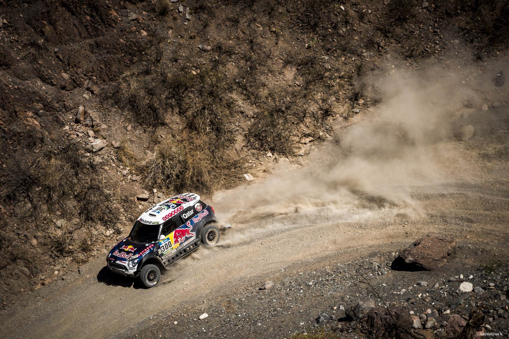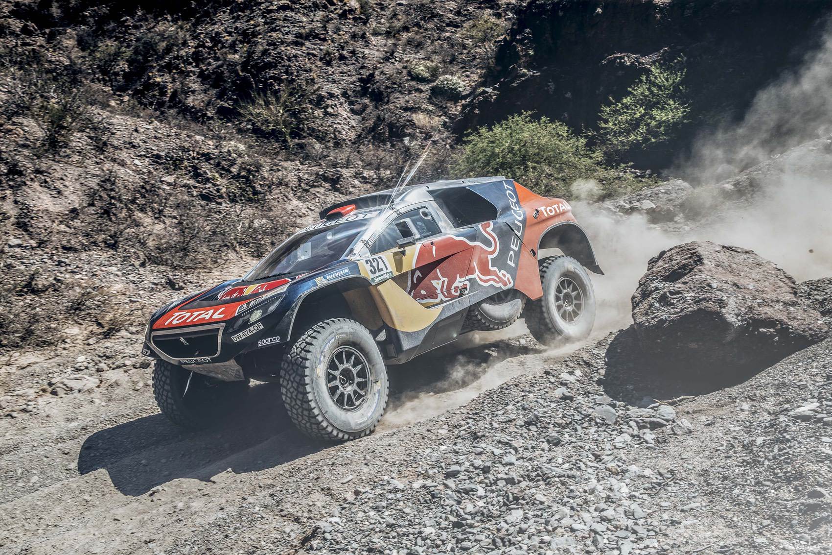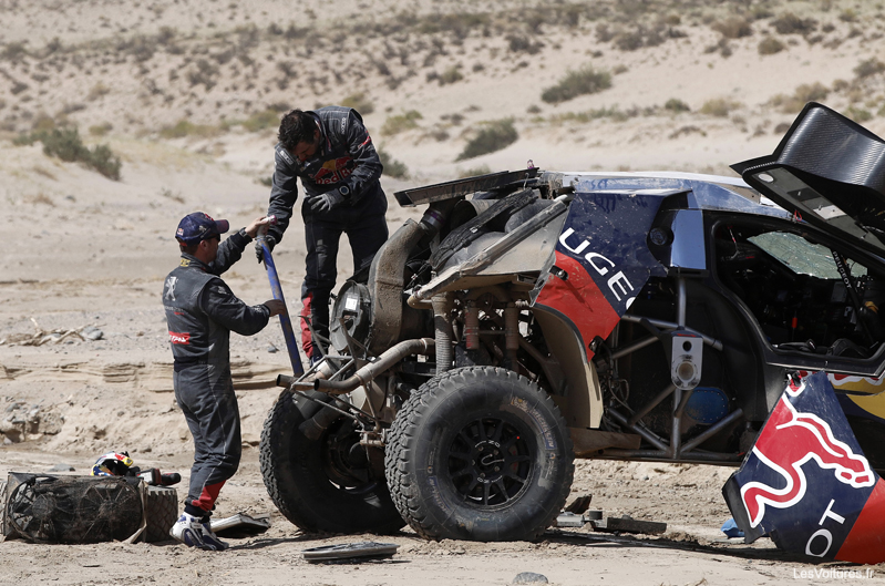 Déchainés au volant de leurs « lionnes », les pilotes Peugeot se sont alors lancés dans une remontée exceptionnelle pour finalement échouer à 12 et 31 secondes de la MINI All4 Racing du tenant du titre. Une fin de course au rythme endiablé qui s’est révélée fatale à Sébastien Loeb. « Posé » dans les dunes pendant la Spéciale, le nonuple champion du monde des rallyes WRC a ensuite dû attaquer pour refaire son retard. Et à 20 kilomètres de l’arrivée, il est parti en tonneaux. Indemne, le duo Loeb-Elena, qui a réussi à repartir, est le grand perdant du jour. Loeb explique sa grosse mésaventure : « Dans un rio, il y avait une grosse marche que je n’ai pas vu, et qui nous a envoyé en tonneaux. Dans les rios, on est plus ou moins en hors-piste. Je ne sais pas si j’ai été gourmand, je n’ai pas l’habitude de rouler dans des rios. Je roulais par rapport à ce que je voyais, et la cassure je ne l’ai pas vu : j’aurais mieux fait de rouler un peu de moins vite ou de passer ailleurs. On essaie de suivre les traces, mais elles s’éparpillent un peu, certaines partent à droite, d’autres à gauche… je n’étais pas sur la bonne. Pour la victoire, c’est mort. Déjà, on ne pensait pas arriver au bout. On a perdu pas mal de temps parce qu’on a dû changer les roues, puis un cardan. Donc les espoirs de victoires s’envolent. On savait qu’on ne savait pas tout ! Maintenant il va falloir continuer à rouler, et prendre de l’expérience. »