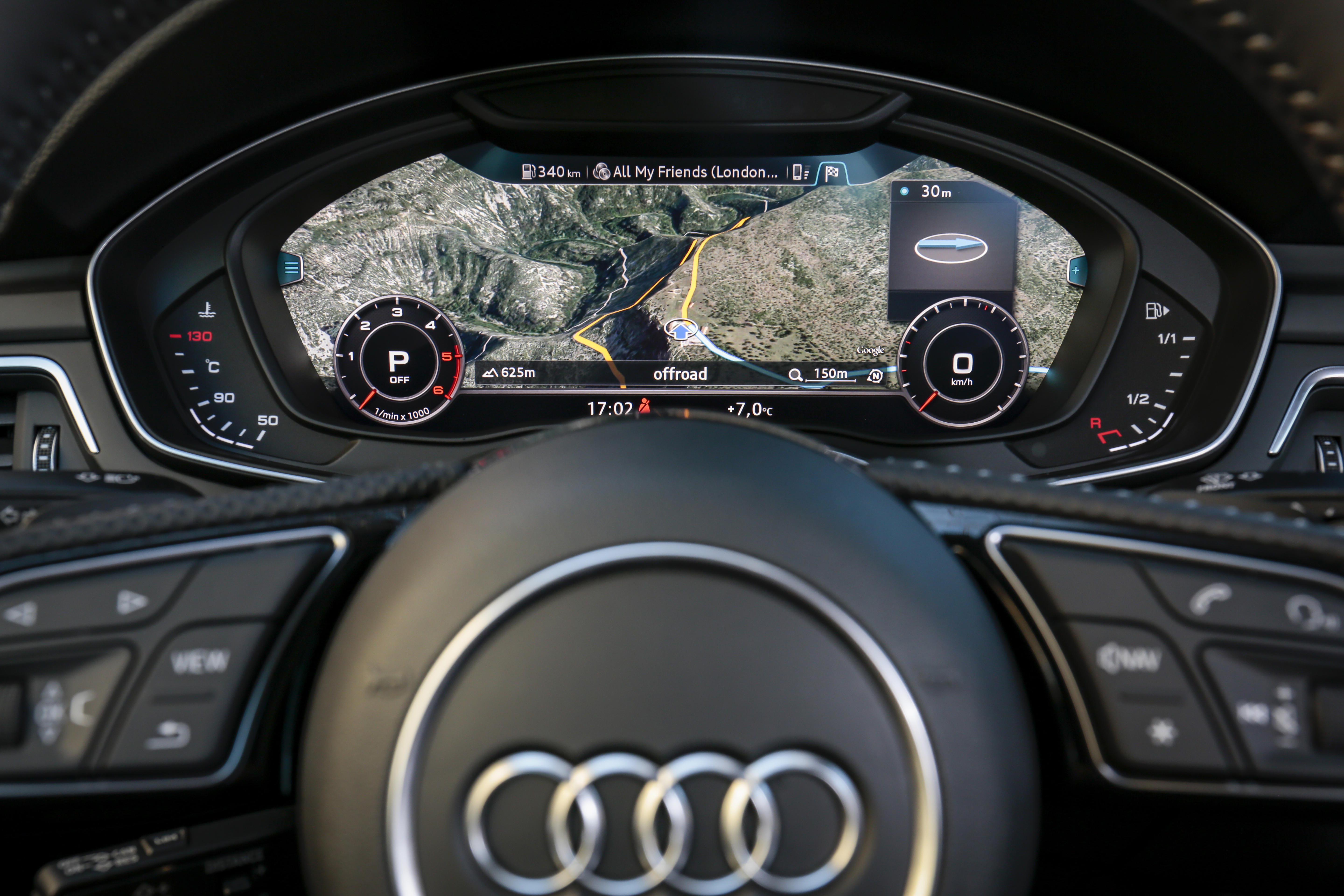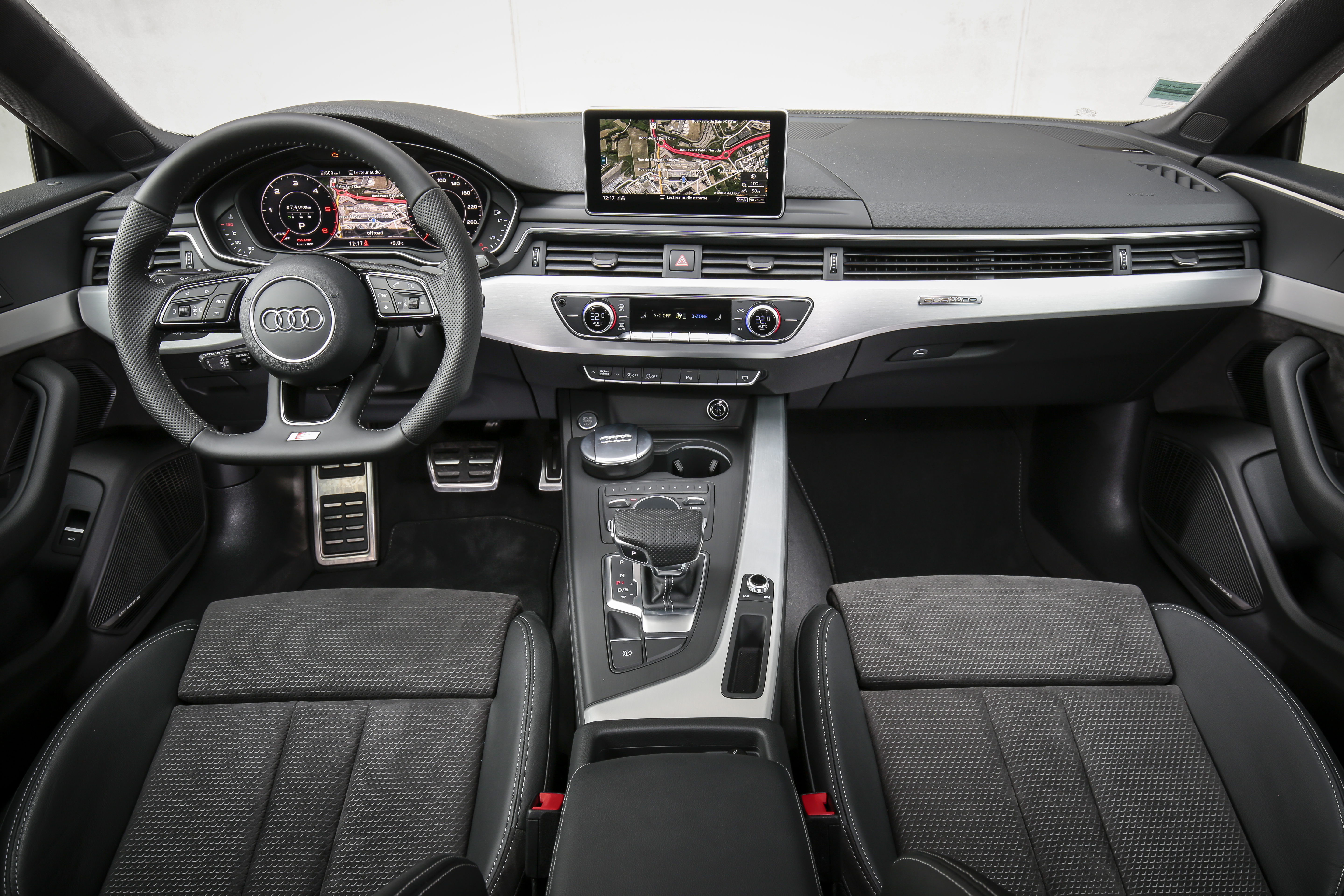 A l’intérieur, on retrouve à l’identique l’ambiance de la sœur A5 Coupé. D’année en année, les technologies ne cessent d’évoluer. Rappelons ainsi que l’Audi Virtual Cockpit est le tout premier dispositif de ce type à être apparu. C’était en 2014 sur l’Audi TT. Bien sûr, les finitions et le choix des matériaux sont sans faille en matière d’assemblage. La ligne S Line, hormis les apports d’un châssis Sport et de la dalle haute définition, distille pléthore de technologies embarquées avec principalement les sièges, volant et pédalier sport, l’aide au parking, l’écran multimédia 8,3″, la connectivité internet, le MMI navigation plus avec MMI touch. Sans oublier la cartographie Google Earth toujours aussi bluffante de réalisme.