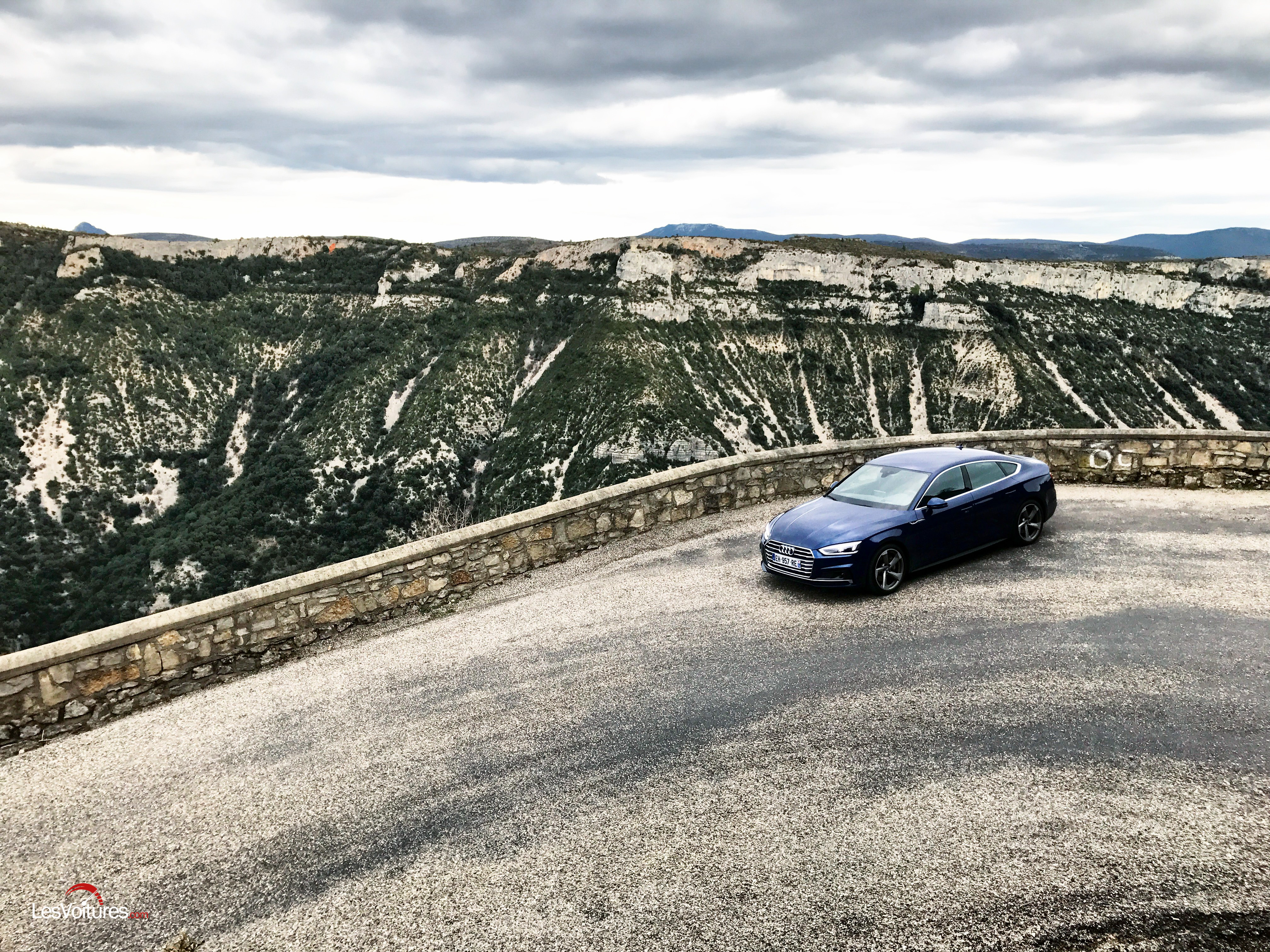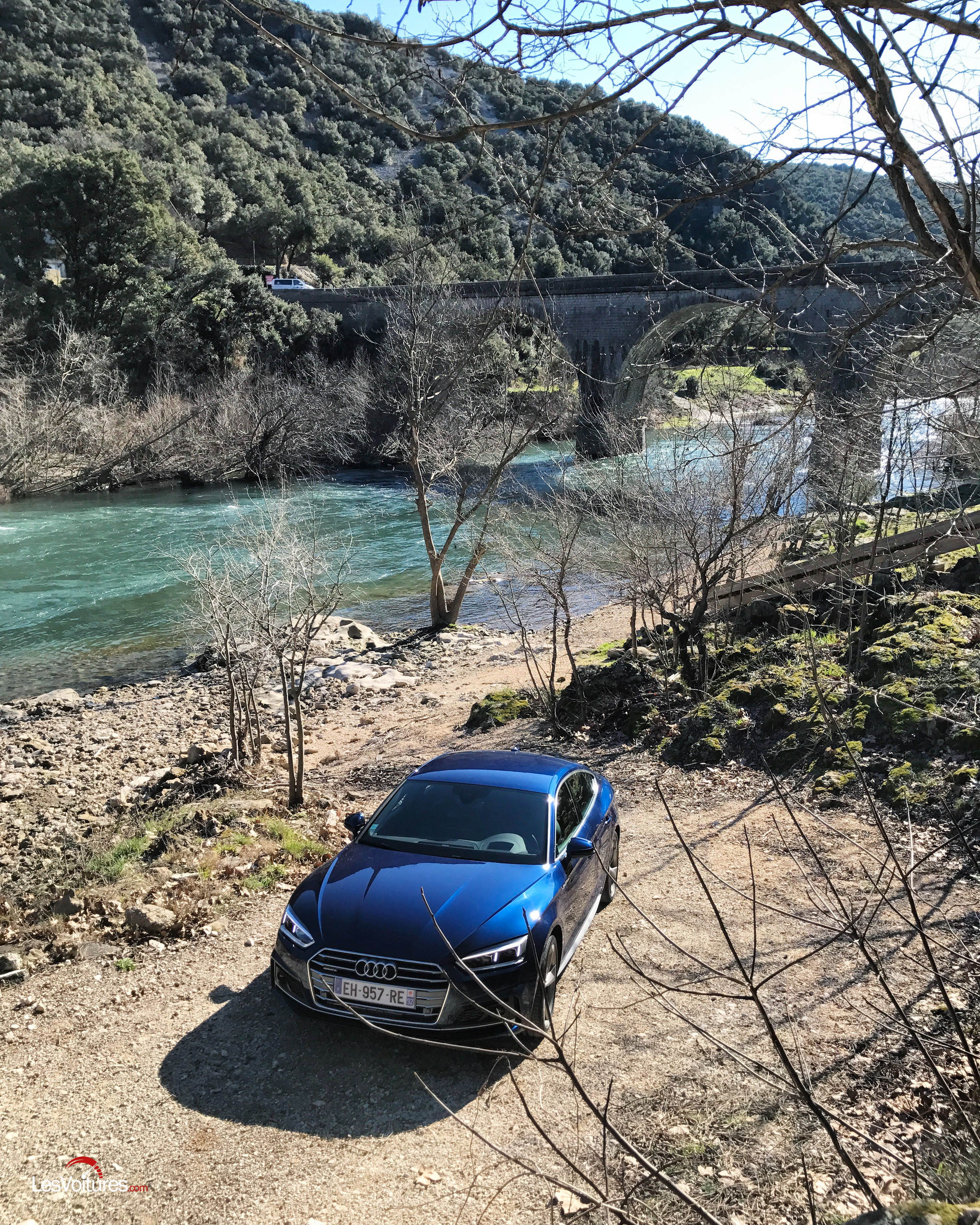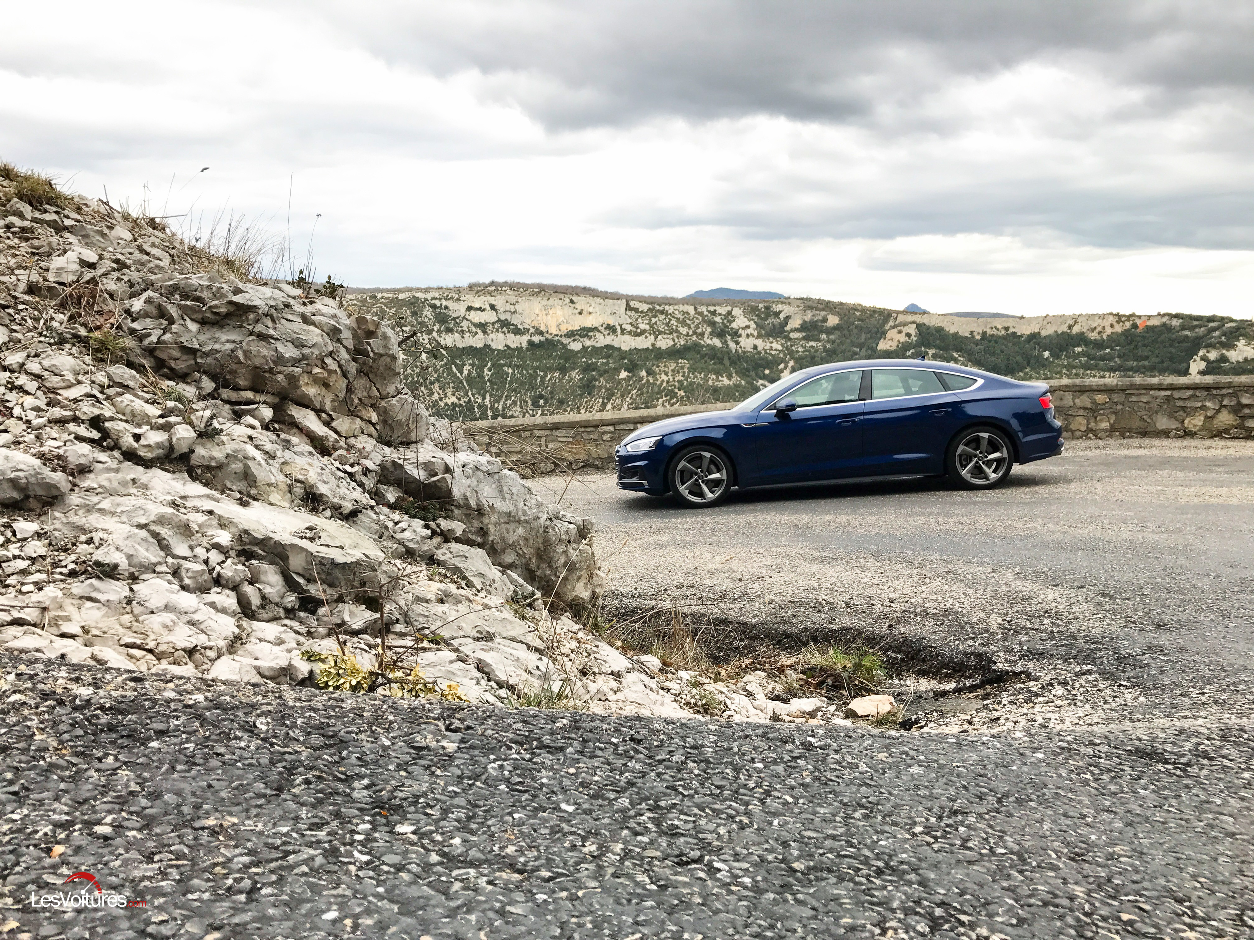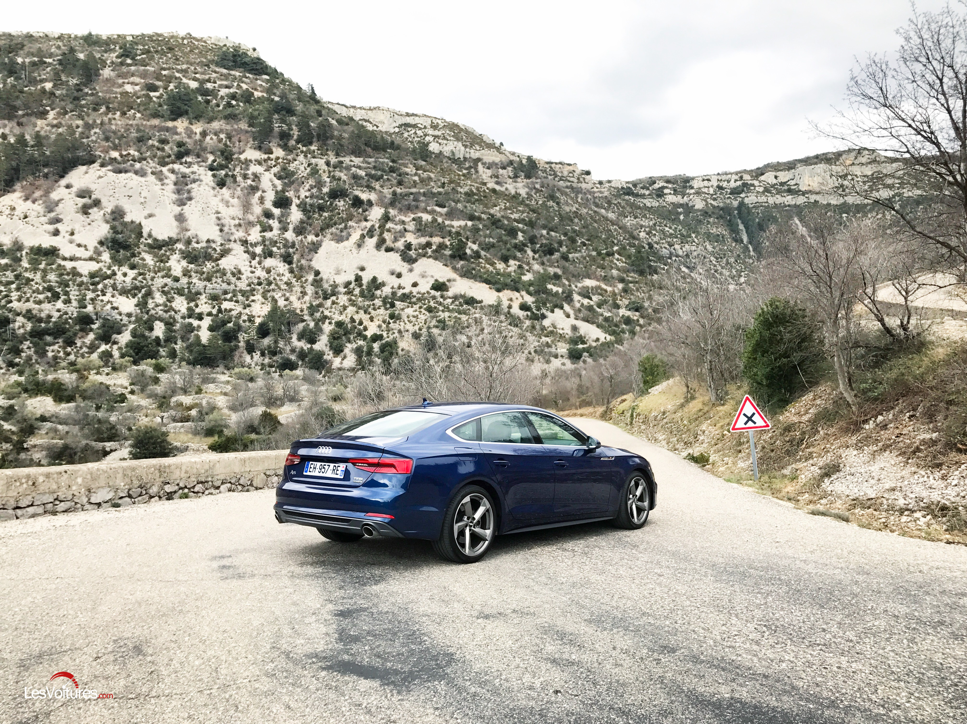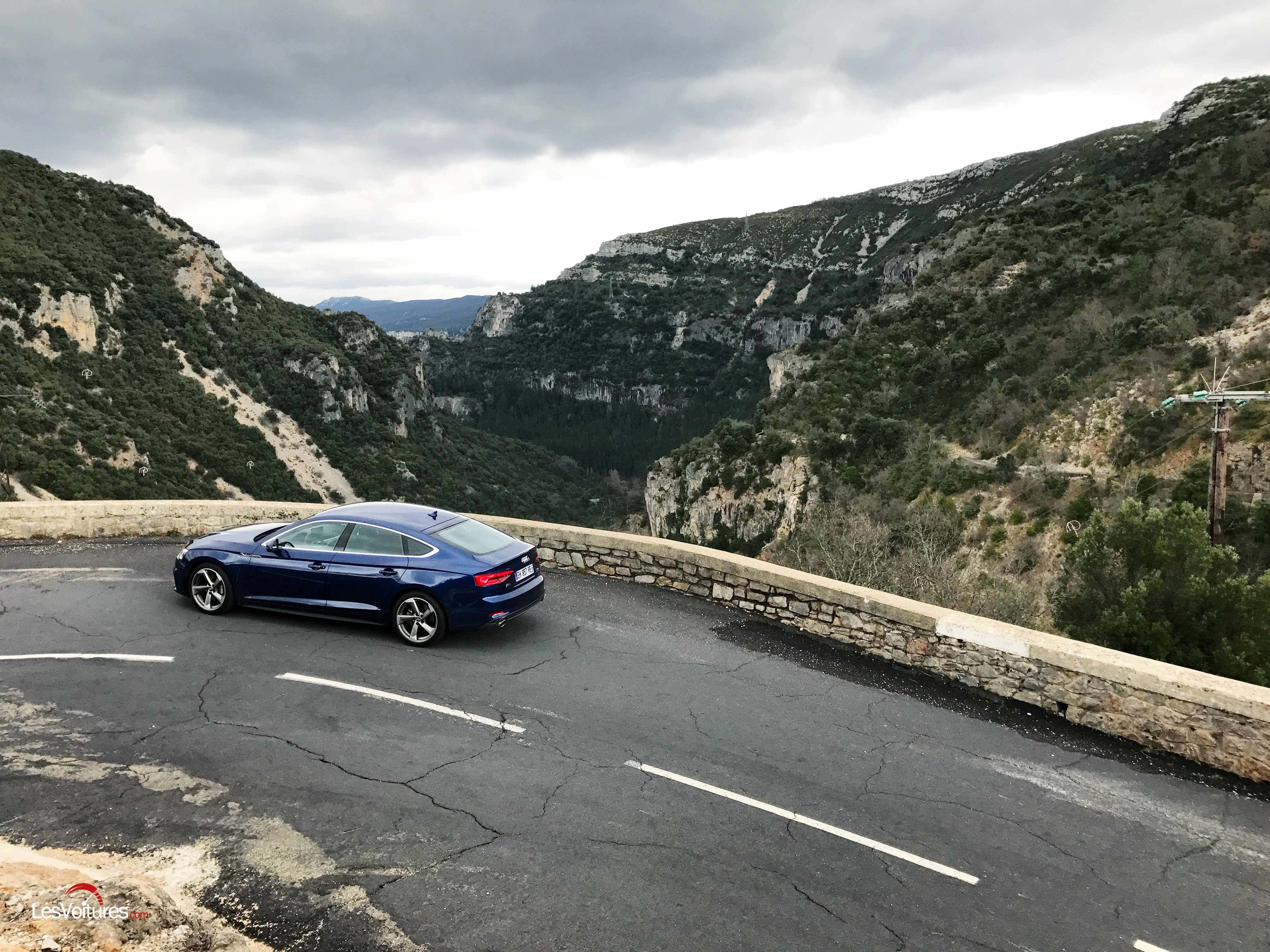 Sur les magnifiques routes des alentours de Montpellier, le 2.0 l TFSI essence de 252 ch trouve un terrain de jeu idéal pour lâcher sa générosité. Suffisamment pour faire oublier le poids conséquent de l’A5 Sportback : 1 610 kilos à vide. De plus, le gabarit important de l’auto ne « bride » pas son agilité. La transmission intégrale quattro fait encore des merveilles sur ce point. Ajoutez à cela le châssis Sport et une monte pneumatique en 19″ (Jantes alu coulé en style turbine 5 branches, option : 1 935 €) et vous obtiendrez clairement un typage sportif ferme fort intéressant. Un autre chiffre permet d’étayer nos propos sur le comportement alléchant de l’A5 Sportback 2.0 l TFSI, celui de son couple : 370 Nm (entre 1 600 et 4 500 tr/min). Il suffit alors de laisser faire le travail de changement des rapports par la boîte S tronic et le coupé 5 portes se relance avec une aisance déconcertante en sortie de virage. Audi précise que les changements de vitesses s’effectuent « en 0,2 s, sans rupture de charge. » Le savoir-faire allemand et la maîtrise des hautes technologies du constructeur d’Ingolstadt font des miracles. Il faudra néanmoins faire preuve d’une certain sagesse au volant et ne pas attaquer à outrance sous peine de se faire surprendre par excès d’optimisme. A cadence très élevée, le train arrière a tendance à ne pas suivre.