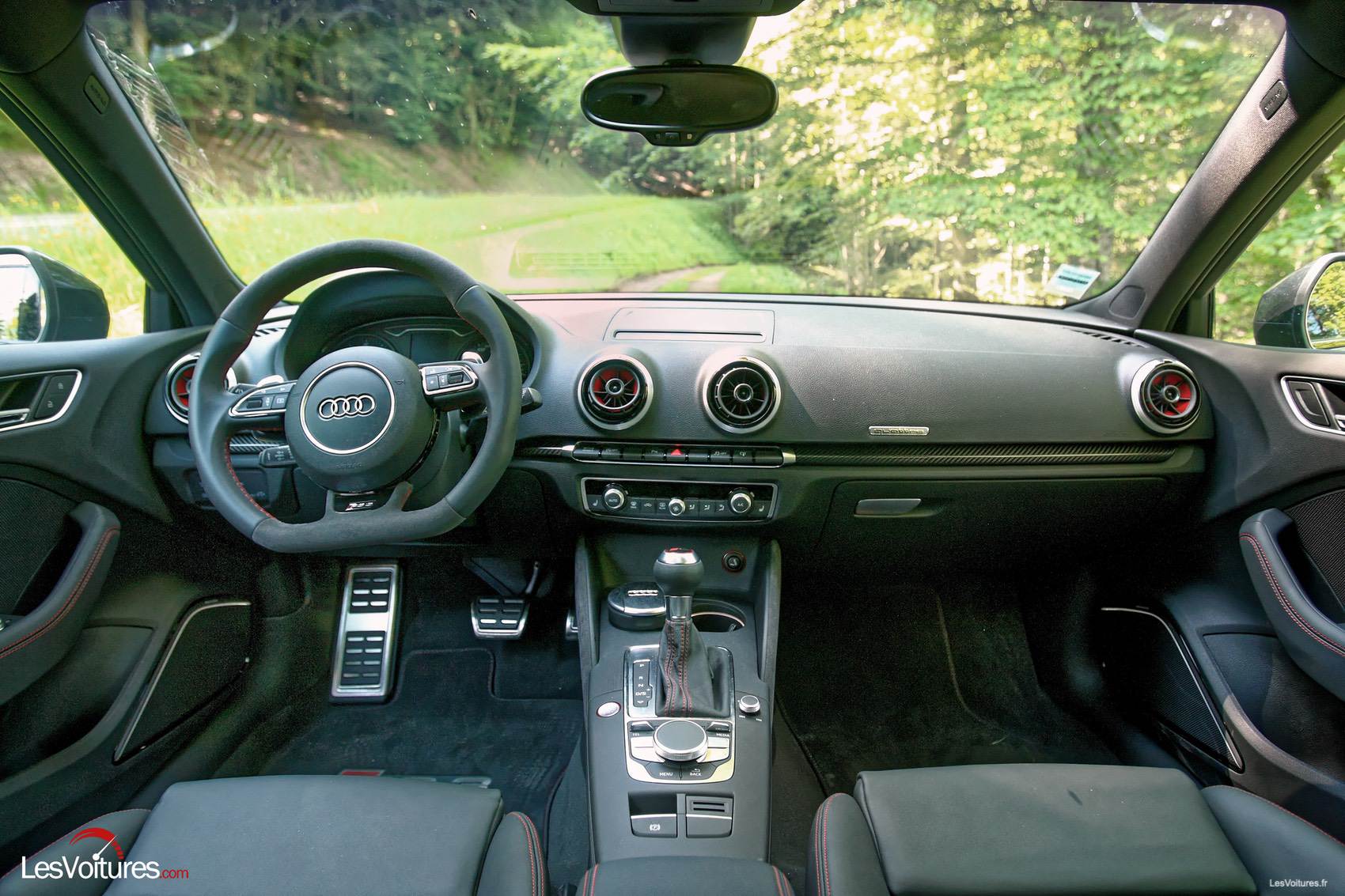 Une pression sur ce petit bouton, et le monstre sort de sa torpeur. Jusqu’alors, rien ne nous faisait vraiment douter, et rien ne nous impressionnait plus que ça. La belle était athlétique, certes, mais dans un style tout à fait acceptable. Cependant, au réveil de son cœur à 5 ventricules, un frisson parcourt l’échine et l’excitation nous gagne véritablement. Le 5 cylindres TFSI 2.5 l émet une sonorité rauque formidable, se rapprochant étonnement du son que produisent certains V8. Couplé à la boîte automatique S-tronic 7 rapports à double embrayage, et à une transmission quattro, rappelons que ce moulin développe 367 chevaux et un couple de 465 Nm disponible entre 1625 et 5500 tr/min. Le 0 à 100 km/h est ainsi annoncé en 4,3 secondes pour une vitesse maximale de 250 km/h, relevable à 280 km/h en option (moyennant 1 800 €). Quelle époque, des compactes 5 portes survitaminées viennent challenger les performances de coupés sports tel que la Porsche 911 Carrera de 350 chevaux (4,6 s sur le 0 à 100 km/h) ! Le tout pour un moteur respectant la norme Euro 6, dont les émissions de CO2 ne sont « que » de 189 g/km, et dont la consommation mixte annoncée est de 8,1 l/100 km. Une consommation qui reste relativement raisonnable, même si elle s’est plutôt élevée aux alentours des 12 l/100 km durant notre essai.