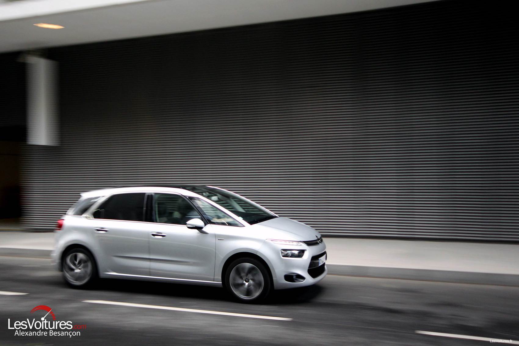 Esthétiquement, le C4 Picasso profite de la dernière plate-forme PSA EMP2 dont il est le premier à bénéficier. Son rendu global est ainsi très ramassé ce qui casse avec l’image des monospaces hauts, au visuel pataud et lourd. Le dynamisme est de rigueur et les jantes en alliage de 18″ « Eole » (option) inscrivent le C4 Picasso dans le vent du dynamisme. La signature latérale chromée brille et donne cette touche de raffinement nécessaire pour plaire aux plus exigeants. Les designers de la marque aux chevrons ont pris des risques en métamorphosant l’avant du C4 avec des feux en position horizontale surmontés par des feux à LED finement intégrés. L’aspect massif, du bouclier avant du C4, est alors magnifié, grâce au logo sans fin qui épouse les LED et à la grande prise d’air basique mais très réussie.