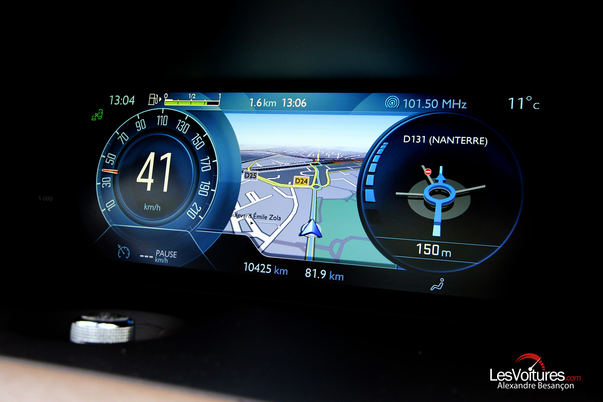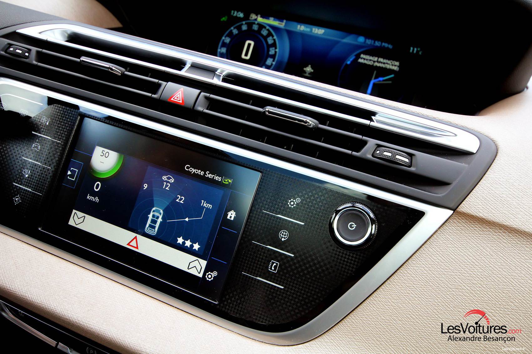 Une fois installé au volant, bonne surprise (ou pas, pour les passionnés de Citroën) car le volant à moyeu fixe a disparu au profit d’un volant cossu aux multiples commandes, revêtu également de cuir nappa. L’usage de chrome en fait un objet très agréable à prendre en mains. D’autres touches de chrome subliment un intérieur « High-tech » qui n’a rien à envier à la gamme DS. La planche de bord intègre deux écrans. Un premier de 12 pouces HD, qui permet de visualiser les informations classiques de conduite, et un plus petit, tactile, de 7 pouces. Ensemble, ils forment ce qui se fait de mieux en termes d’affichage et d’aide à la conduite. Le « Citroën Multicity Connect », de série sur notre version Exclusive, y est pour beaucoup. Il inclut : un bouquet de services connectés Citroën avec un maximum d’applications tel un smartphone embarqué, avec en natif, Coyote, Trip Advisor, des applications pour trouver une station-service, ses prix et rechercher un parking.