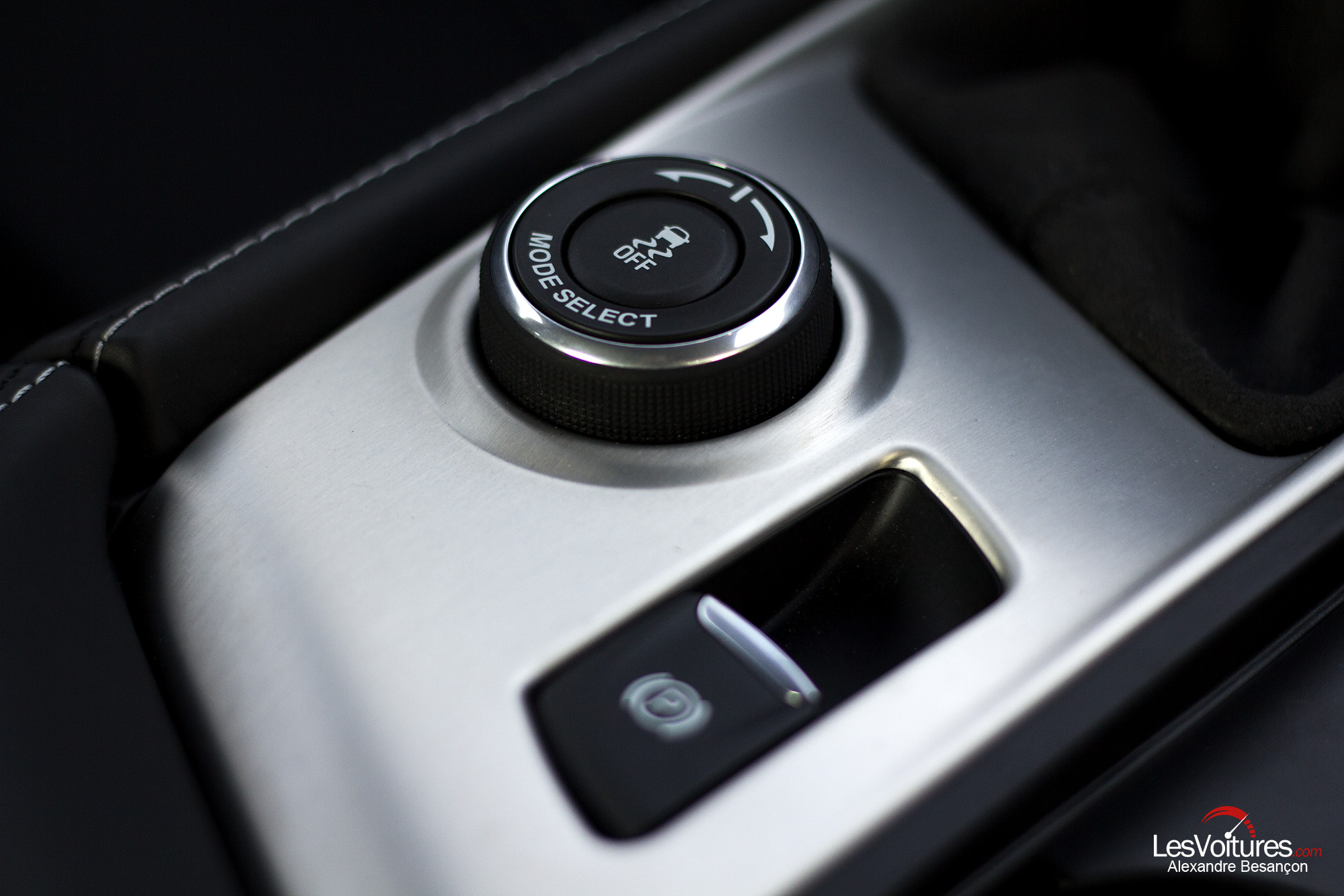 Avant de conclure notre reportage et pour être tout à fait complet, concentrons-nous sans transition sur l’intérieur de la C7 Stingray. Comme pour le design de la Supercar, c’est un nouveau bond en avant réalisé par les ingénieurs et stylistes américains. Les finitions sont impeccables et l’austérité, pour ne pas dire autre chose, des anciennes générations de Corvette est enfin de l’histoire ancienne. Les sièges procurent une position idéale et un confort ultime qui nous a clairement surpris. Les équipements de bord sont pléthores, la Corvette C7 n’a pas à rougir, sans faire de jeu de mot, face à la concurrence européenne. L’habitacle de la Supercar dégage un tempérament sportif et élégant grâce à la continuité de la planche de bord qui se poursuit jusqu’à la base de la console centrale, tout près de notre mug de compétition ! Si on devait trouver un seul défaut à la finition, ce serait peut-être les parties en carbone au rendu un peu trop brut qui mériteraient un traitement plus haut de gamme, brillant. L’électronique est parfaitement intégrée et l’ergonomie ne souffre d’aucun défaut. Les yeux fixés à l’horizon, le dispositif HUD vous donnera toutes les informations utiles.