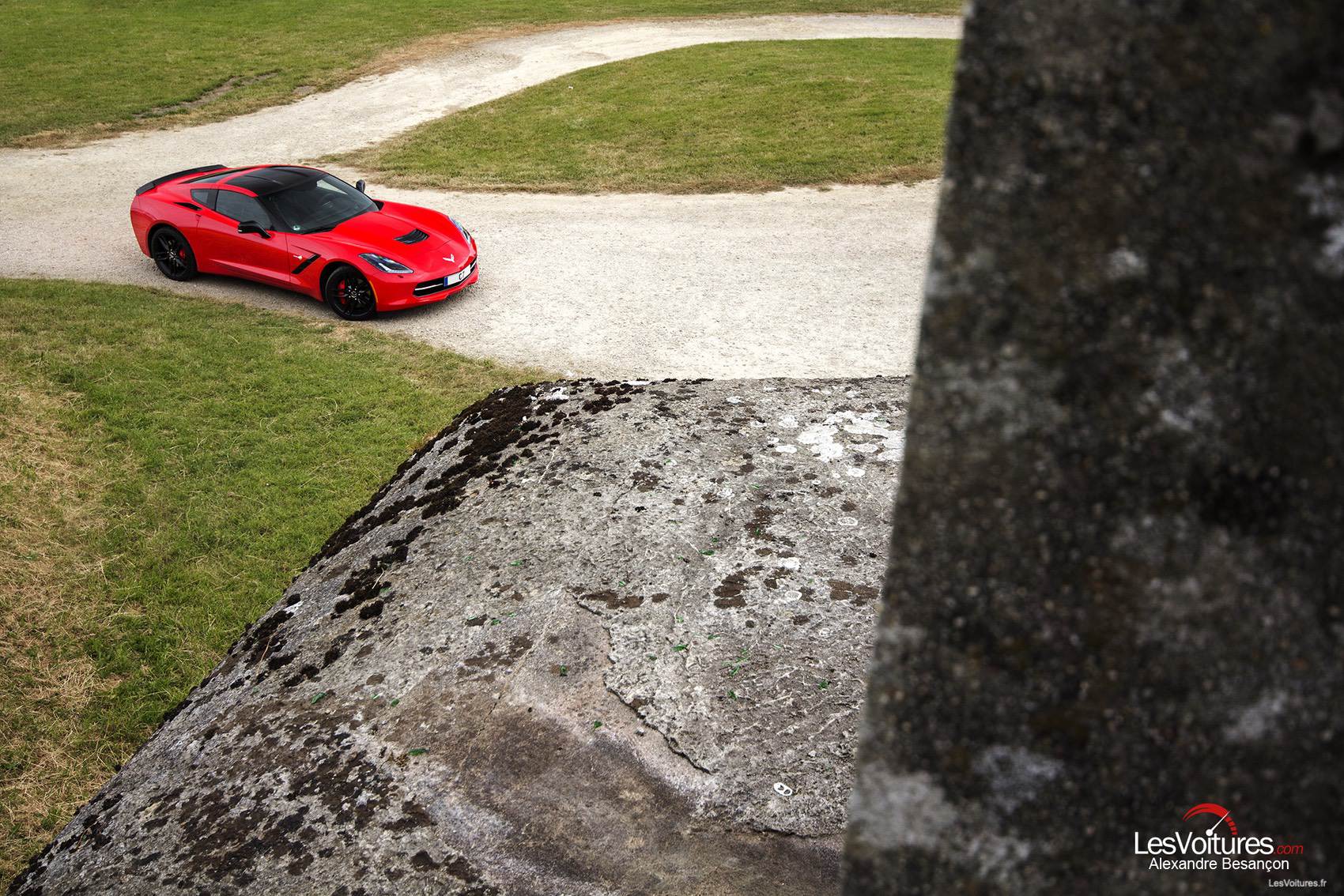 Pour notre seconde et dernière étape, direction Arromanches-les-Bains avec un large détour pour aller chercher Saint-Marcouf. Ceci par les terres via les petites routes de Normandie qui nous font traverser des villages, l’occasion de tester la C7 en ville. La « Torch Red » (torche rouge), dénomination reprise à la couleur de la C7 Stingray d’essai, sait évoluer en milieu urbain avec facilité. Son système de gestion intelligent du carburant désactive alors 4 cylindres pour gagner en consommation. Le couple phénoménal de l’auto lui procure alors toujours autant d’aisance même à très bas régime. Mais cela reste insuffisant en termes d’économie de carburant en ville car la C7 Stingray affiche 19,1 l/100 km en cycle urbain. La bonne surprise vient des chiffres sur autoroute et en cycle mixte avec respectivement 7,8 l/100 km et 12 l/100 km. Et l’entente entre la France et les Etats-Unis ne se porte pas sur le malus écologique. Pour preuve les 8 000,00 € à débourser (279 g/km d’émissions de CO2).