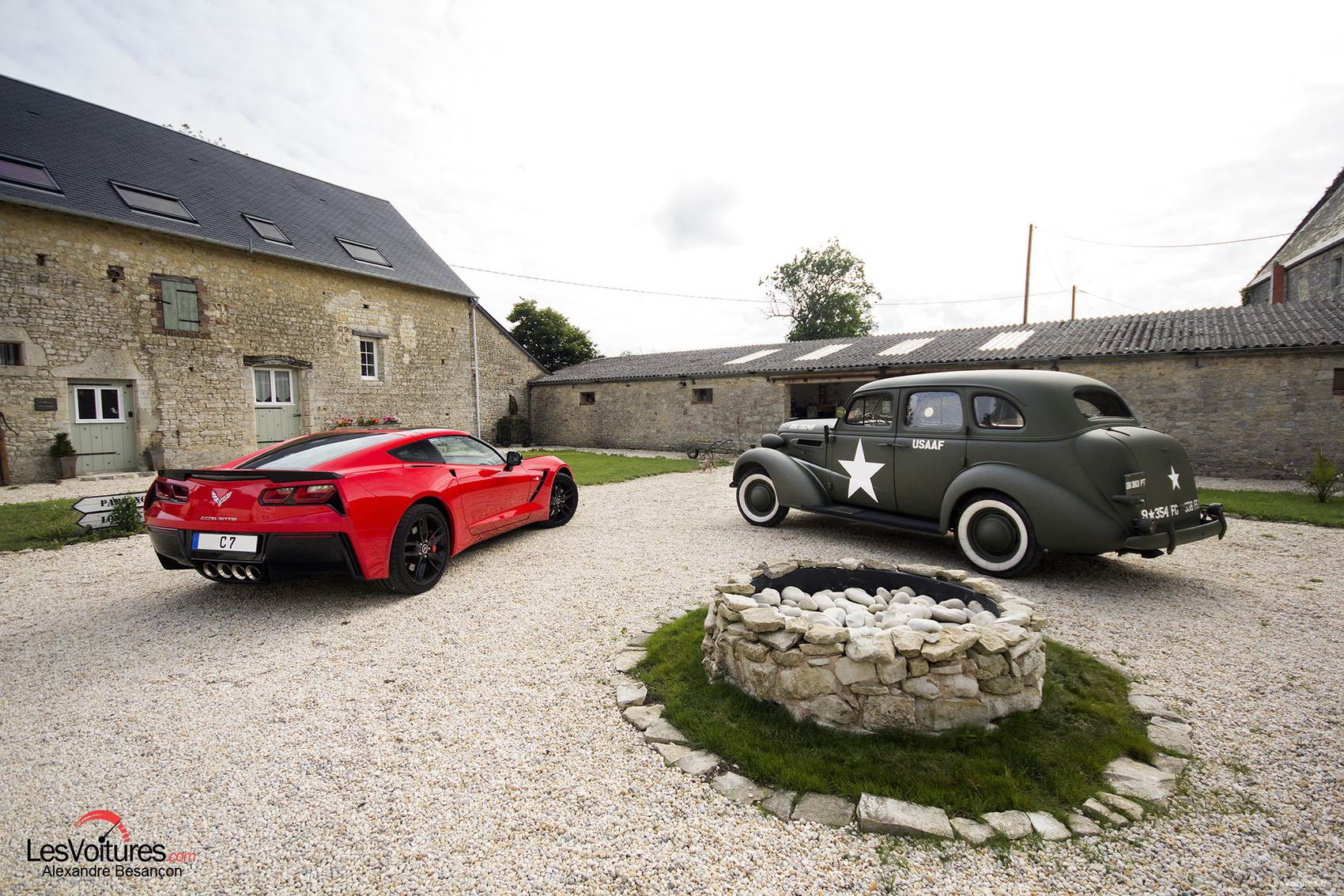 Puisque le guide touristique le plus connu au monde porte la marque des pneus qui équipent la C7 Stingray, LesVoitures.com vous conseille légitimement de venir découvrir la Normandie au Spirit of 1944. Laurent vous accompagnera dans la région et vous plongera dans l’atmosphère du Débarquement avec un programme sur-mesure qui va beaucoup plus loin que les meilleurs guides touristiques. Il a d’ailleurs été notre guide privilégié lors de notre road trip. En Amoureux de belles voitures d’époque, il est également l’heureux propriétaire d’une Chevrolet Master Deluxe de 1938. Les deux « Chevy », que 75 ans d’histoire séparent, prennent solennellement la pose sous la « Bannière étoilée », » The Union Jack » et notre « Tricolore ».