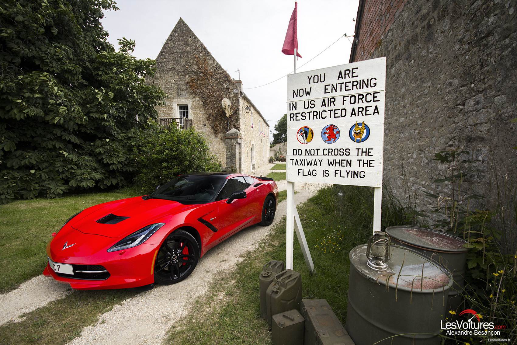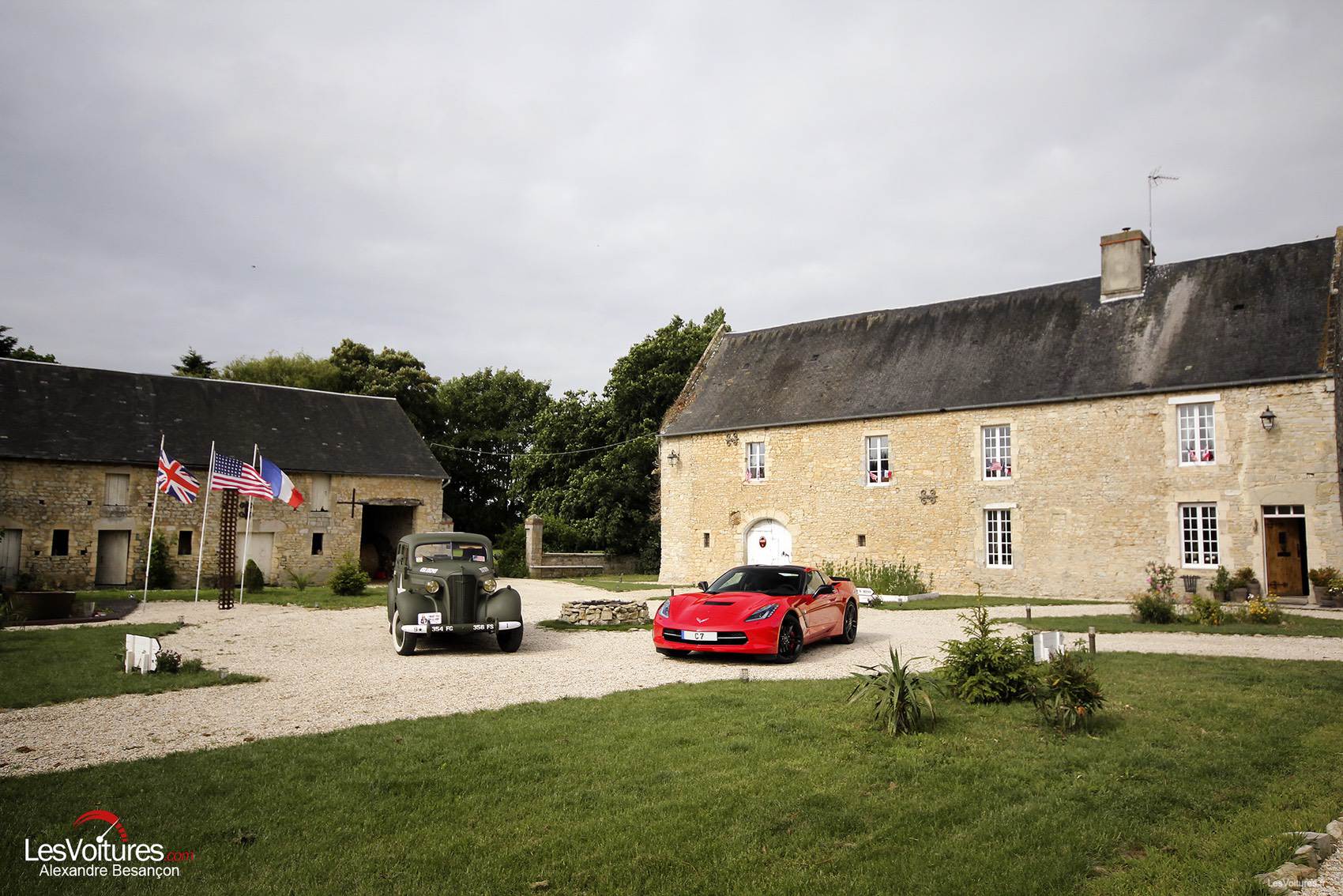 Puisque le guide touristique le plus connu au monde porte la marque des pneus qui équipent la C7 Stingray, LesVoitures.com vous conseille légitimement de venir découvrir la Normandie au Spirit of 1944. Laurent vous accompagnera dans la région et vous plongera dans l’atmosphère du Débarquement avec un programme sur-mesure qui va beaucoup plus loin que les meilleurs guides touristiques. Il a d’ailleurs été notre guide privilégié lors de notre road trip. En Amoureux de belles voitures d’époque, il est également l’heureux propriétaire d’une Chevrolet Master Deluxe de 1938. Les deux « Chevy », que 75 ans d’histoire séparent, prennent solennellement la pose sous la « Bannière étoilée », » The Union Jack » et notre « Tricolore ».