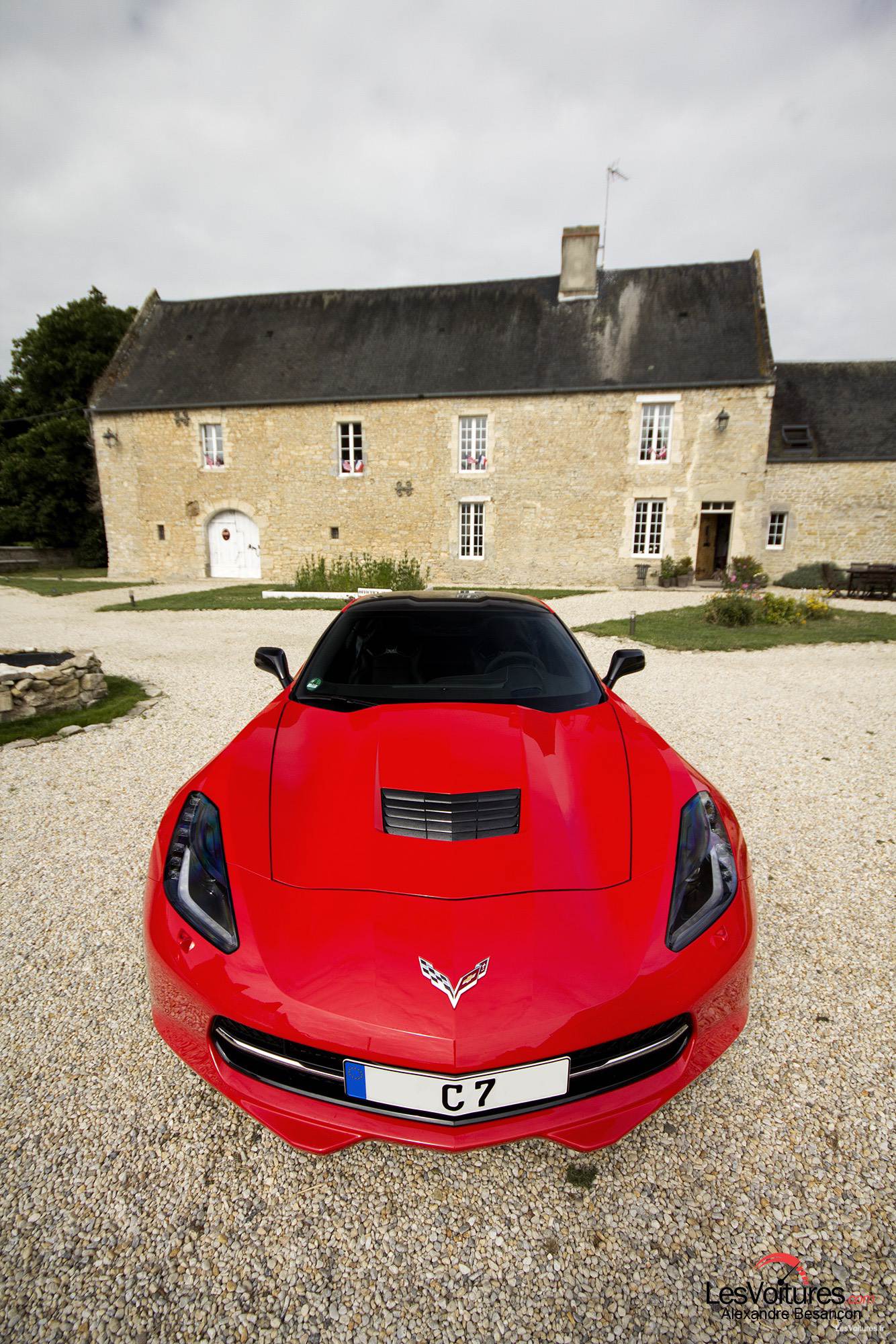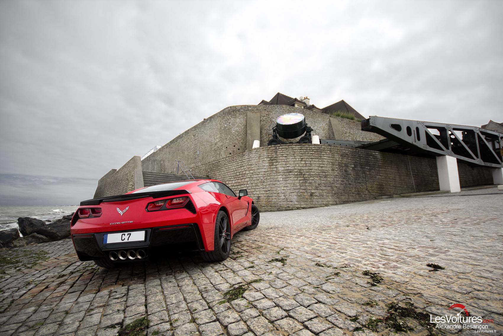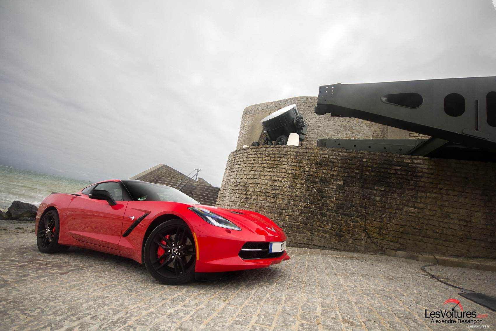 Pour notre seconde et dernière étape, direction Arromanches-les-Bains avec un large détour pour aller chercher Saint-Marcouf. Ceci par les terres via les petites routes de Normandie qui nous font traverser des villages, l’occasion de tester la C7 en ville. La « Torch Red » (torche rouge), dénomination reprise à la couleur de la C7 Stingray d’essai, sait évoluer en milieu urbain avec facilité. Son système de gestion intelligent du carburant désactive alors 4 cylindres pour gagner en consommation. Le couple phénoménal de l’auto lui procure alors toujours autant d’aisance même à très bas régime. Mais cela reste insuffisant en termes d’économie de carburant en ville car la C7 Stingray affiche 19,1 l/100 km en cycle urbain. La bonne surprise vient des chiffres sur autoroute et en cycle mixte avec respectivement 7,8 l/100 km et 12 l/100 km. Et l’entente entre la France et les Etats-Unis ne se porte pas sur le malus écologique. Pour preuve les 8 000,00 € à débourser (279 g/km d’émissions de CO2).