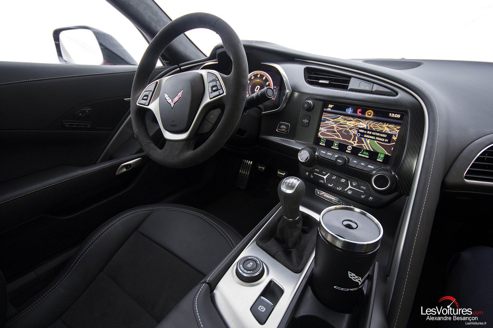 Avant de conclure notre reportage et pour être tout à fait complet, concentrons-nous sans transition sur l’intérieur de la C7 Stingray. Comme pour le design de la Supercar, c’est un nouveau bond en avant réalisé par les ingénieurs et stylistes américains. Les finitions sont impeccables et l’austérité, pour ne pas dire autre chose, des anciennes générations de Corvette est enfin de l’histoire ancienne. Les sièges procurent une position idéale et un confort ultime qui nous a clairement surpris. Les équipements de bord sont pléthores, la Corvette C7 n’a pas à rougir, sans faire de jeu de mot, face à la concurrence européenne. L’habitacle de la Supercar dégage un tempérament sportif et élégant grâce à la continuité de la planche de bord qui se poursuit jusqu’à la base de la console centrale, tout près de notre mug de compétition ! Si on devait trouver un seul défaut à la finition, ce serait peut-être les parties en carbone au rendu un peu trop brut qui mériteraient un traitement plus haut de gamme, brillant. L’électronique est parfaitement intégrée et l’ergonomie ne souffre d’aucun défaut. Les yeux fixés à l’horizon, le dispositif HUD vous donnera toutes les informations utiles.