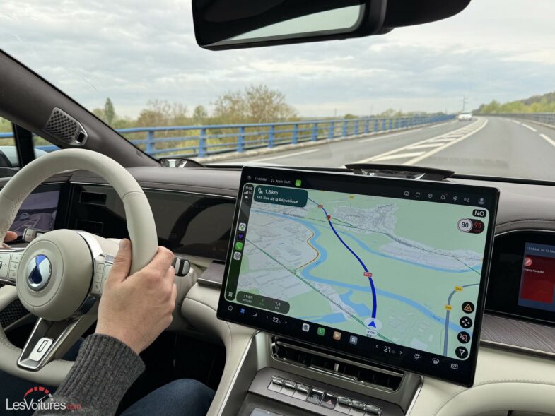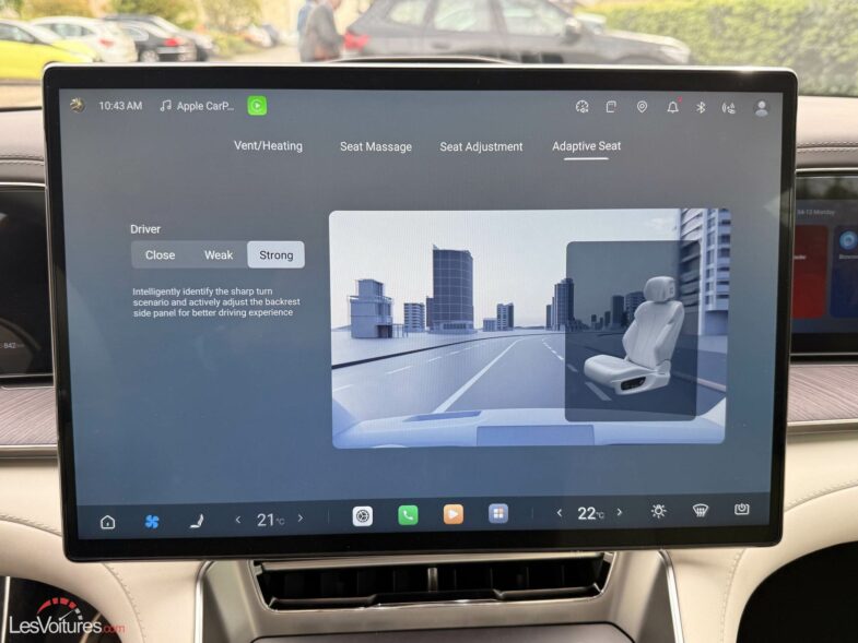 L’interface logicielle trahit parfois sa jeunesse avec quelques traductions hasardeuses, voire des textes en chinois, mais dans le cadre de notre essai de la Denza Z9GT, nos voitures étaient des pré‑séries. La climatisation automatique est peu intuitive et souffle chaud comme froid. Le régulateur de vitesse adaptatif manque parfois de souplesse avec quelques coups de frein intempestifs. Cependant, à l’arrière, l’espace aux jambes est royal, mais la garde au toit limite l’accueil des passagers de plus de 1,85 m.