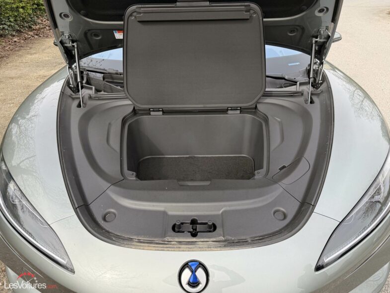 Le coffre arrière annonce 495 l (478 l en hybride), ce qui est correct, mais pas exceptionnel pour ce gabarit. Le seuil de chargement est assez haut, la batterie « Cell‑to‑Body » limitant l’accès au fond. Avantage de la version électrique : un frunk de 53 l à l’avant, idéal pour les câbles de recharge. La PHEV n’en dispose pas.
