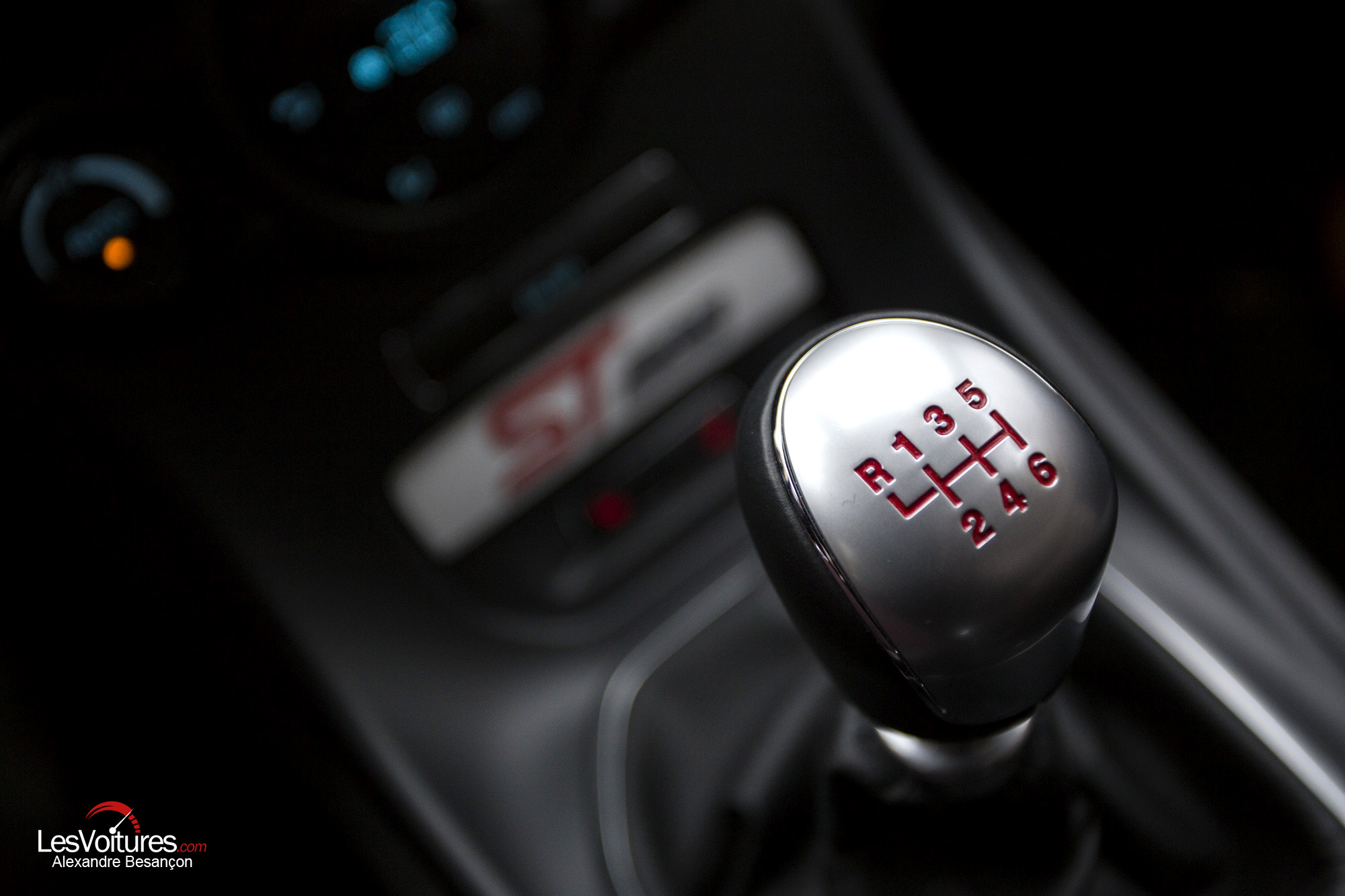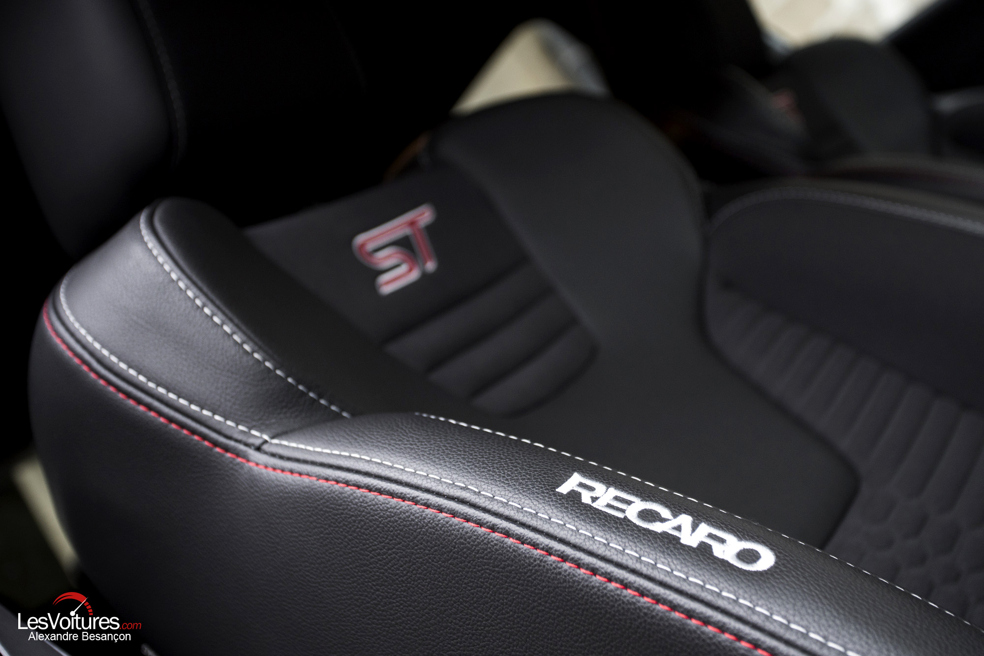 Lorsqu’on pénètre – sans sortir la clé – dans l’habitacle de la Fiesta, l’enthousiasme retombe un peu. En effet, la Ford accuse son âge, avec une présentation quelque peu datée. Le bloc d’info-divertissement, bien que complet, offre une ergonomie plutôt complexe avec de nombreux boutons. L’absence d’écran tactile se fait cruellement sentir, notamment en comparaison des deux françaises citées au début de cet article. L’écran du GPS, en option à 490 €, semble petit, une sensation renforcée par son positionnement en retrait du tableau de bord. En revanche, les éléments sportifs n’ont pas été négligés avec un levier de vitesse en alu du meilleur effet, un pédalier du même métal et un volant sportif à insert ST. Mais aussi, et surtout, une superbe paire de baquets Recaro en cuir et tissu au maintien parfait, en plus d’être chauffants. Toutefois, gare aux excès culinaires, les gabarits les plus généreux se sentiront probablement à l’étroit.