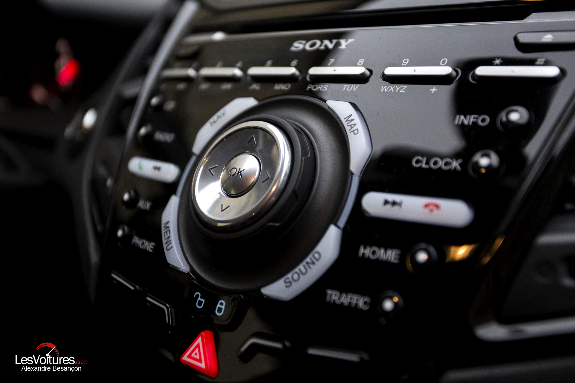 Lorsqu’on pénètre – sans sortir la clé – dans l’habitacle de la Fiesta, l’enthousiasme retombe un peu. En effet, la Ford accuse son âge, avec une présentation quelque peu datée. Le bloc d’info-divertissement, bien que complet, offre une ergonomie plutôt complexe avec de nombreux boutons. L’absence d’écran tactile se fait cruellement sentir, notamment en comparaison des deux françaises citées au début de cet article. L’écran du GPS, en option à 490 €, semble petit, une sensation renforcée par son positionnement en retrait du tableau de bord. En revanche, les éléments sportifs n’ont pas été négligés avec un levier de vitesse en alu du meilleur effet, un pédalier du même métal et un volant sportif à insert ST. Mais aussi, et surtout, une superbe paire de baquets Recaro en cuir et tissu au maintien parfait, en plus d’être chauffants. Toutefois, gare aux excès culinaires, les gabarits les plus généreux se sentiront probablement à l’étroit.