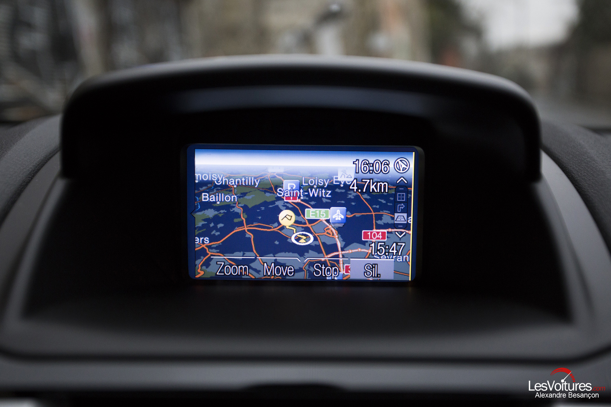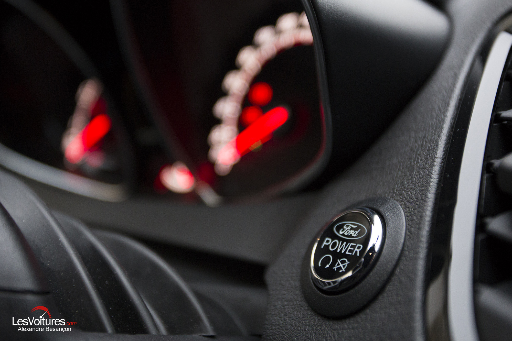 Bien calé dans le baquet gauche, il est temps de presser le bouton Ford POWER, qui n’est autre que le bouton de démarrage du moteur. Tout un programme ! Le petit 4-cylindres 1.6 turbo s’ébroue assez discrètement, tout en laissant un léger grondement pénétrer l’habitacle. Première, le petit levier tombe bien sous la main et la commande de boîte verrouille bien les rapports. Dès les premiers instants, la direction séduit par son côté direct et son ressenti, sans être lourde lorsqu’on évolue en milieu urbain. La position de conduite est très bonne, assis relativement bas (les grands gabarits apprécieront).