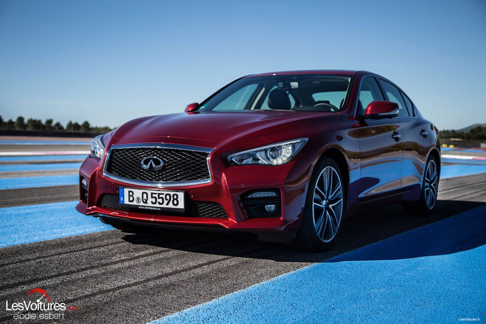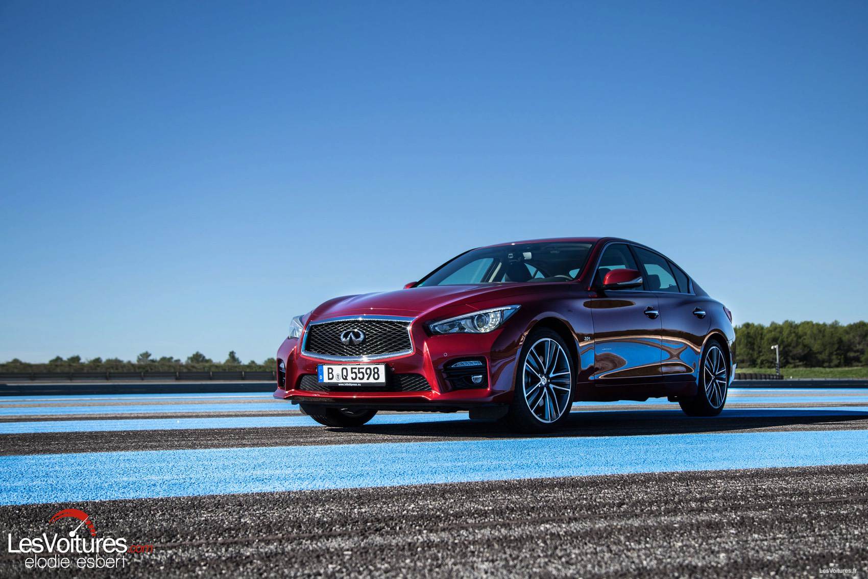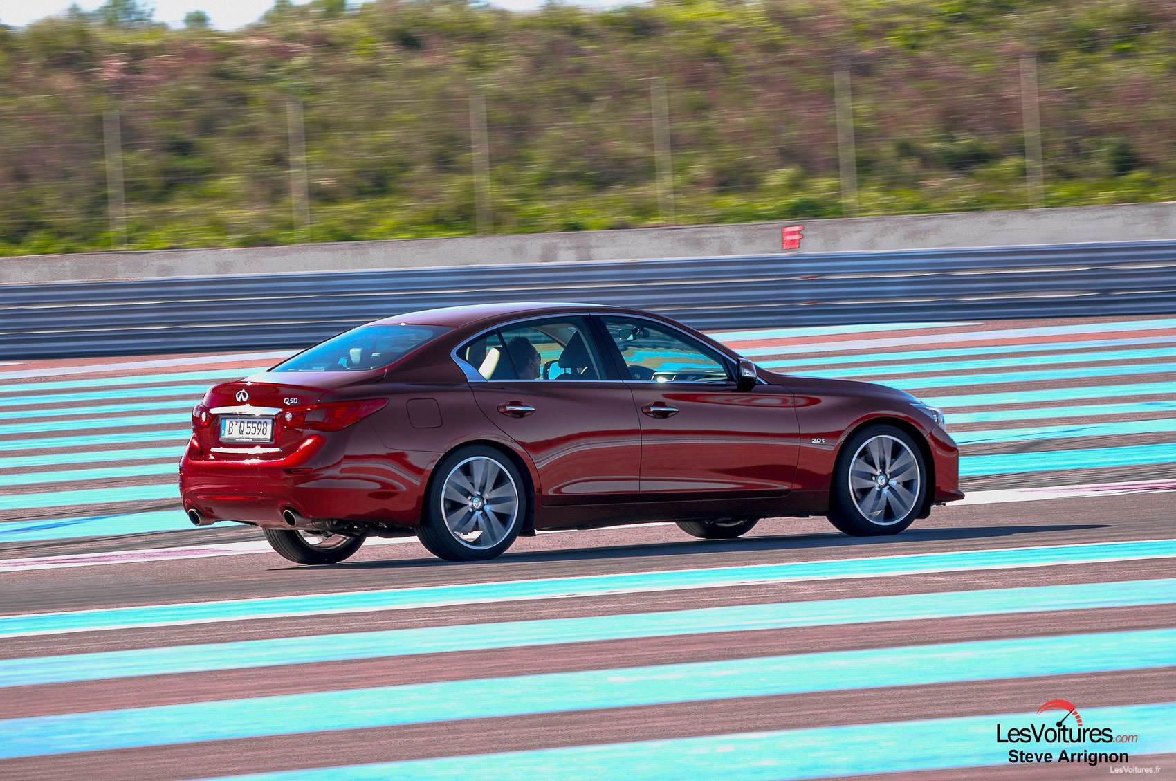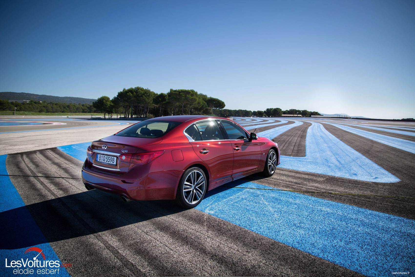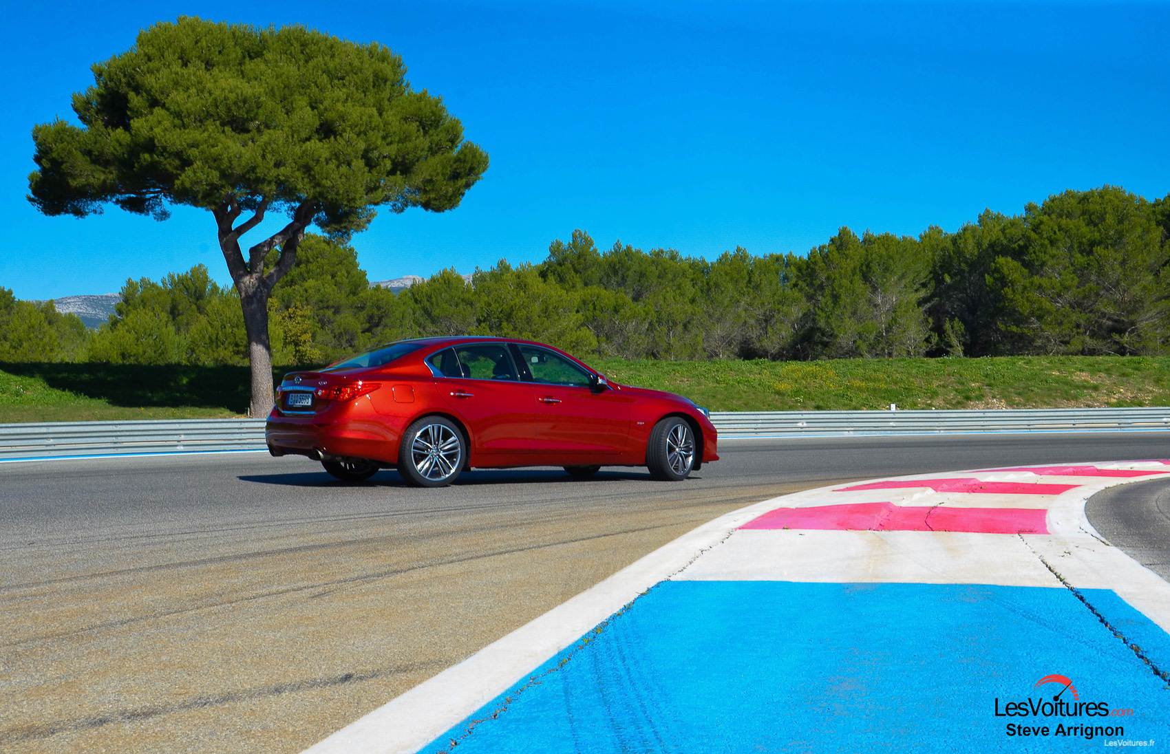 Du bleu au jaune des bandes rugueuses de la piste sarthoise, place au bleu et au rouge de celle du Castellet. Et notre Q50 2.0 l Turbo d’essai passe également au rouge avec la teinte « Venitian Ruby » (option) qui offre, en complément de la finition « Sport », un tout autre aspect à la berline.