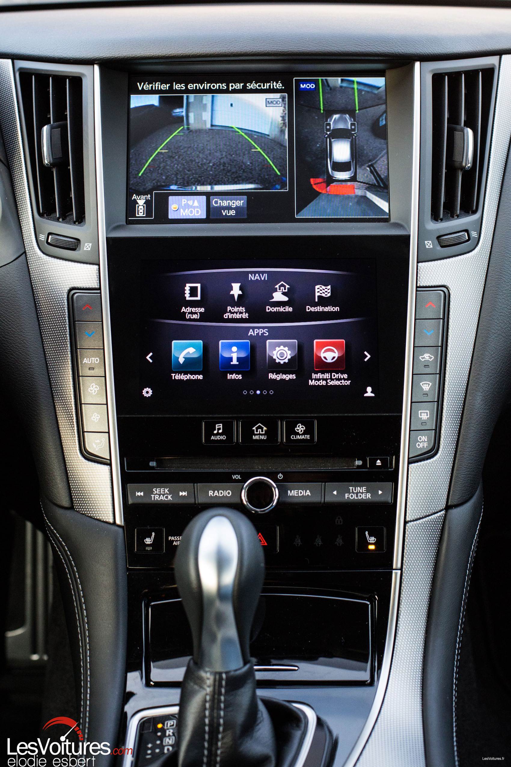 A l’intérieur, la Q50 offre un maximum de confort et d’espace. La position de conduite peut être idéalement paramétrée et les sièges sport en cuir de série (finition « Sport ») sont même chauffants. Le système « Infiniti InTouch » a été très intelligemment pensé, les paramétres de l’auto, les multiples aides à la conduite pouvant être réglés intuitivement. Le volant qui intègre des boutons « facilitateurs » est digne des meilleurs berlines du moment.