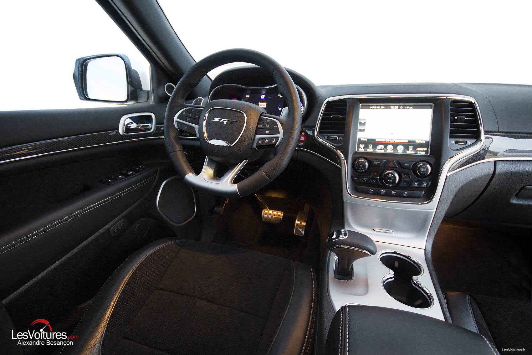 Fibre de carbone, cuir Nappa, accompagnent un fantastique volant que l’on ne veut plus jamais lâcher une fois en mains. L’écran de l’ordinateur de bord, d’une taille de 7″, peut afficher de multiples informations paramétrables sans limites. Evoluer en France et en ville en Grand Cherokee SRT pourrait paraître délicat, mais les technologies proposées en série sont hyper efficaces. Surtout le système d’avertissement anticollision actif. Une fois réglé, il a pour avantage de tenir à distance le 4×4 du véhicule qui le précède automatiquement, comme un grand.