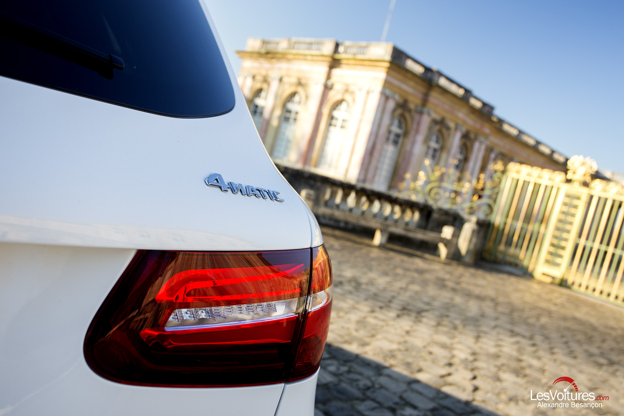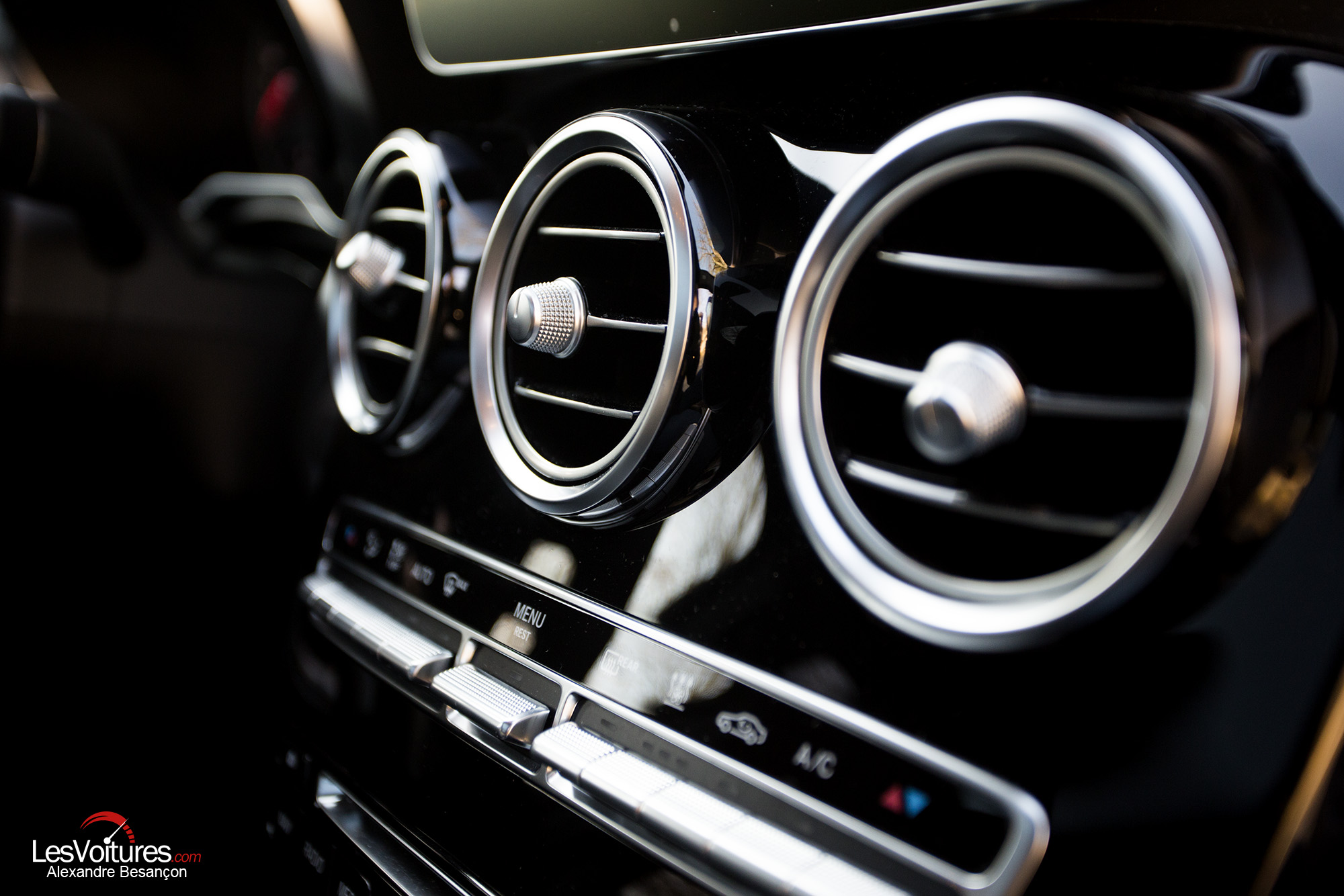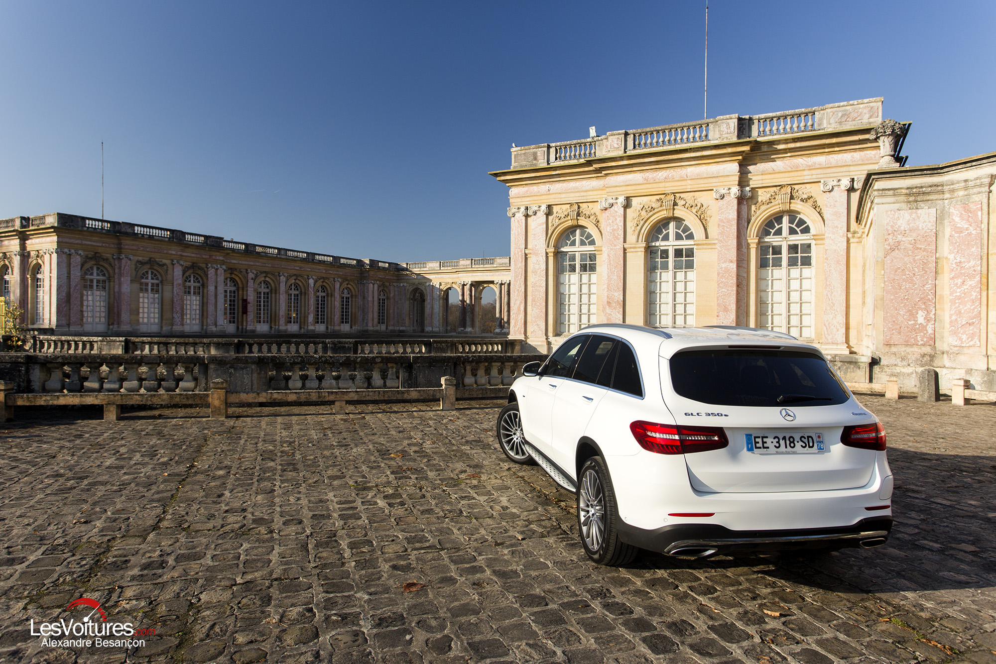A l’intérieur, le GLC dispose du très sombre Pack AMG Line intérieur d’une qualité exceptionnelle. Les sièges avant sport sont accompagnés de garnitures intérieures aux surpiqûres joliment contrastées. La sellerie en cuir noir est comme toujours chez Mercedes d’une finition irréprochable (option : 2 000 €). Le volant sport multifonctions à 3 branches en cuir, de nombreux inserts en aluminium clairs et en noir laqué, le pédalier sport en acier inoxydable brossé contribuent à développer une ambiance puissante et racée. De plus, notre GLC dispose du toit ouvrant panoramique électrique en verre (option : 1 750 €). Ce « carrosse des temps modernes » est beau et lumineux. Il est sublimé, le temps d’un cliché, par la lumière du « Roi Soleil »…