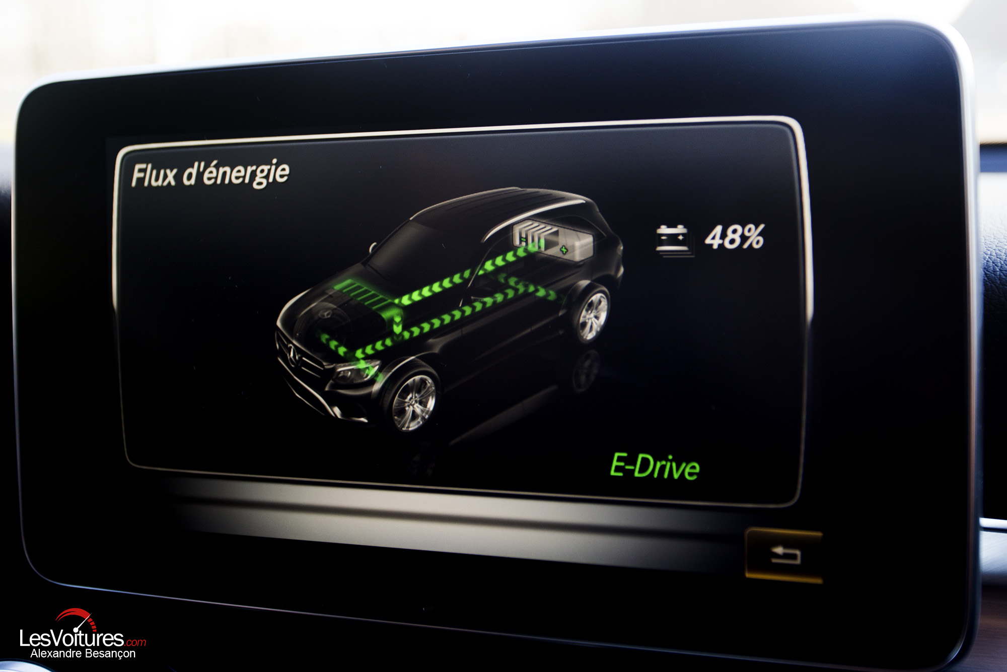 Contact… Bien sûr, la motorisation hybride ne déclenche aucune émotion à sa mise en route. Seul l’écran nous informe que le SUV est prêt à se mouvoir. Ce terme prend toute son importance sur le GLC 350 e car de multiples modes de conduite sont disponibles. Tout d’abord, et osons les qualifier de classiques, on trouve les modes du DYNAMIC SELECT : Eco, Confort, Sport, Sport+, Individuel. Rappelons qu’ils agissent sur la réponse de la pédale d’accélérateur, la boîte de vitesses et la direction. Puis l’hybridation ajoute 4 autres modes via un autre bouton : E-MODE (100% électrique), E-CHARGE (100% thermique), E-SAVE et HYBRID. Détaillons-les rapidement. L’E-CHARGE utilise donc uniquement l’énergie électrique (85 kW, l’équivalent de 116 ch). L’autonomie est alors assez faible : 34 km. En E-CHARGE, c’est le 4-cylindres qui de 211 ch et 320 Nm de couple qui fait le job. Mais il charge, de manière fulgurante, la batterie. Ceci dès que l’on freine. En mode E-SAVE, le système électrique n’est que très rarement utilisé. Comme son nom l’indique, il préserve la charge de la batterie. Enfin, et c’est clairement le mode le plus intéressant, l’HYBRID permet de jouir des deux moteurs soit 320 ch de puissance cumulée.