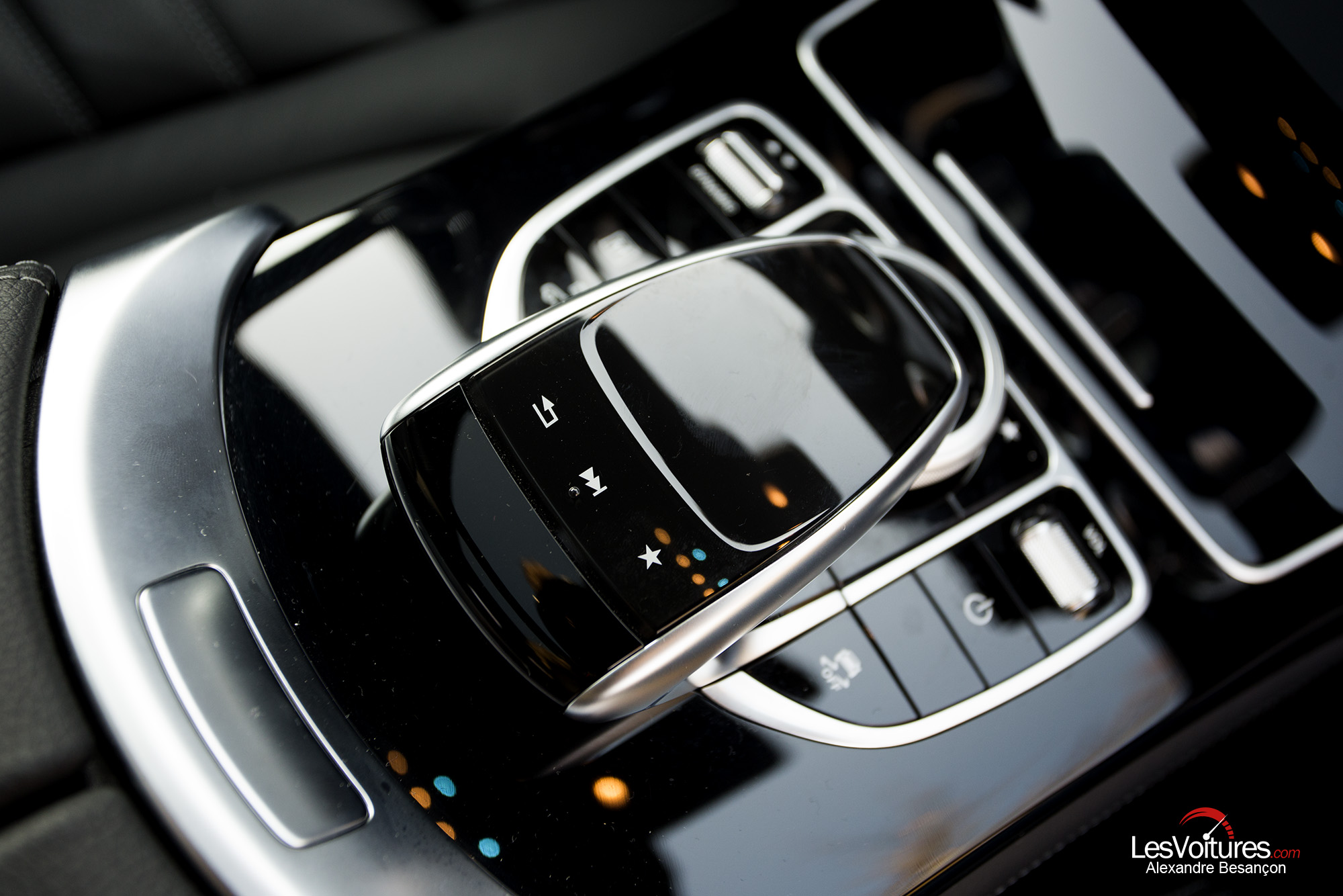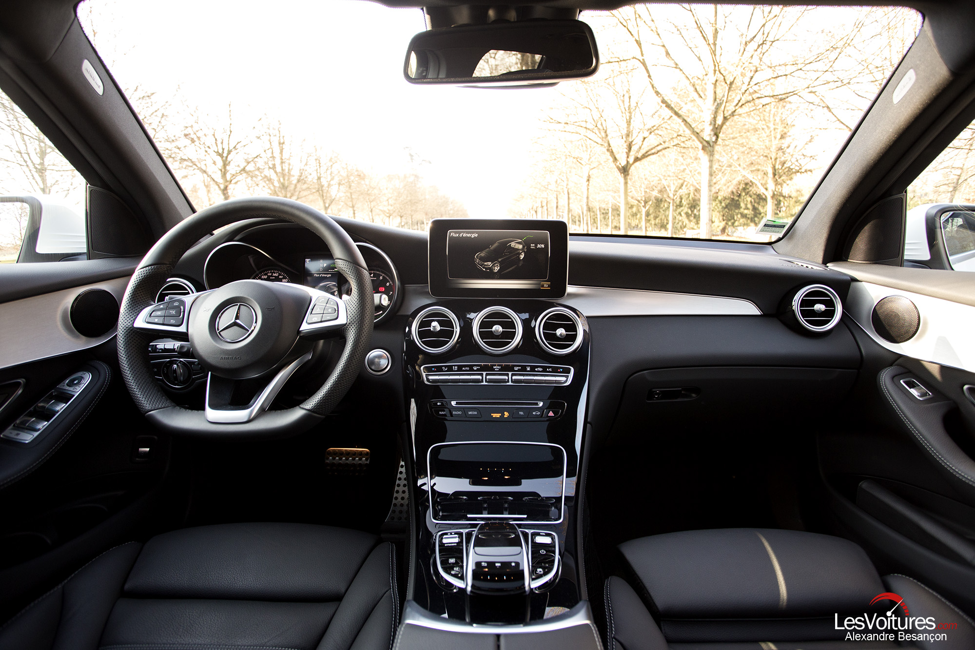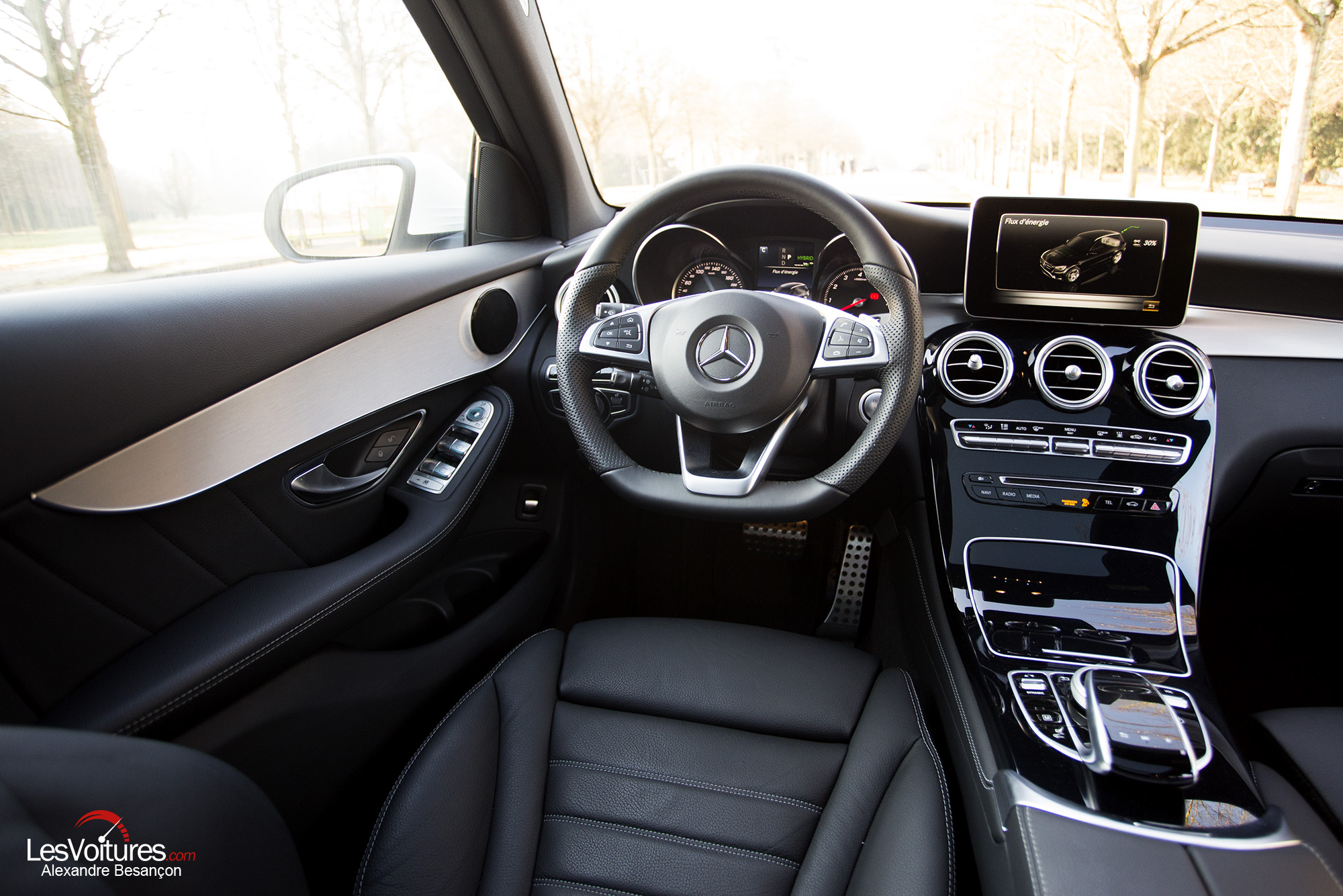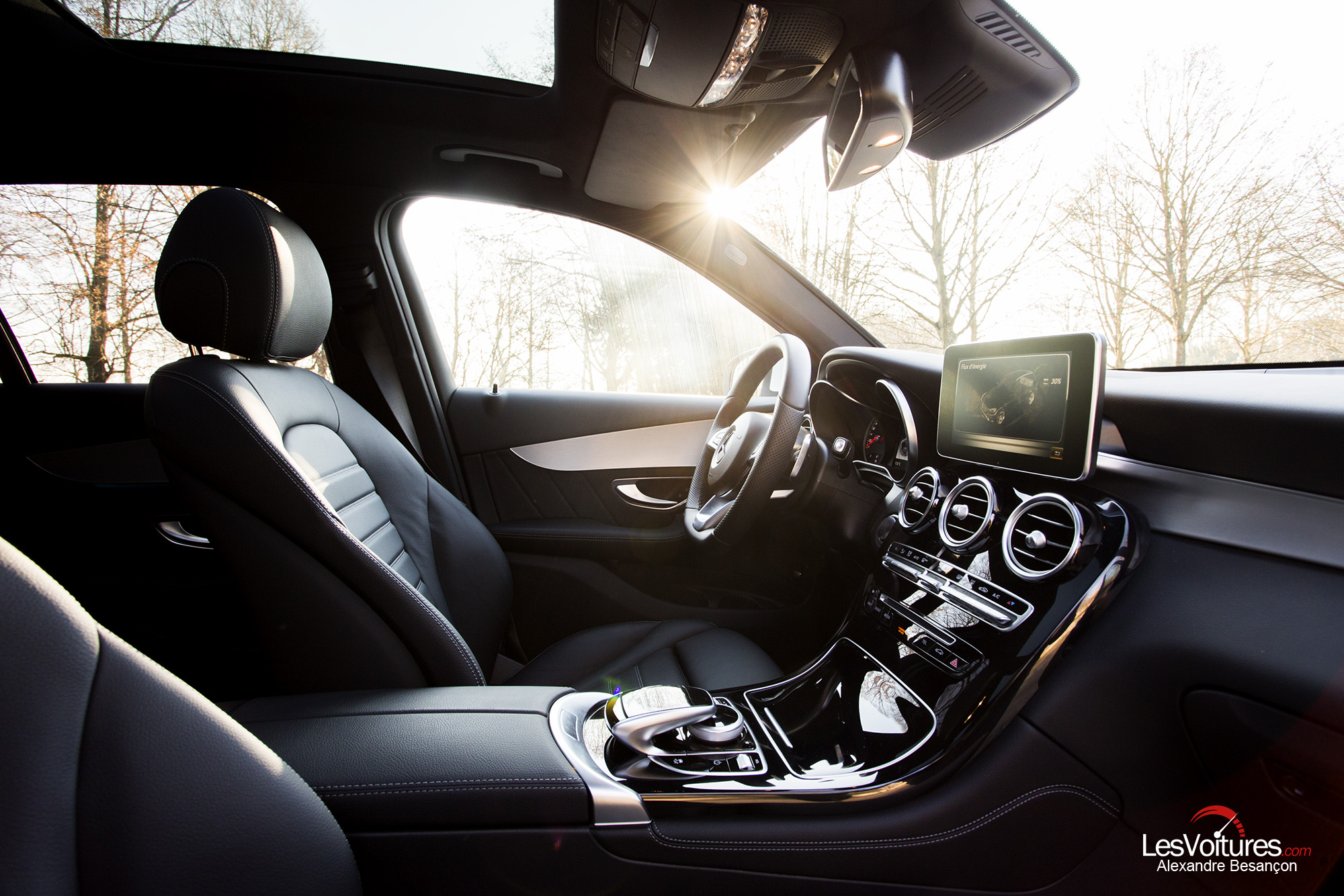 A l’intérieur, le GLC dispose du très sombre Pack AMG Line intérieur d’une qualité exceptionnelle. Les sièges avant sport sont accompagnés de garnitures intérieures aux surpiqûres joliment contrastées. La sellerie en cuir noir est comme toujours chez Mercedes d’une finition irréprochable (option : 2 000 €). Le volant sport multifonctions à 3 branches en cuir, de nombreux inserts en aluminium clairs et en noir laqué, le pédalier sport en acier inoxydable brossé contribuent à développer une ambiance puissante et racée. De plus, notre GLC dispose du toit ouvrant panoramique électrique en verre (option : 1 750 €). Ce « carrosse des temps modernes » est beau et lumineux. Il est sublimé, le temps d’un cliché, par la lumière du « Roi Soleil »…