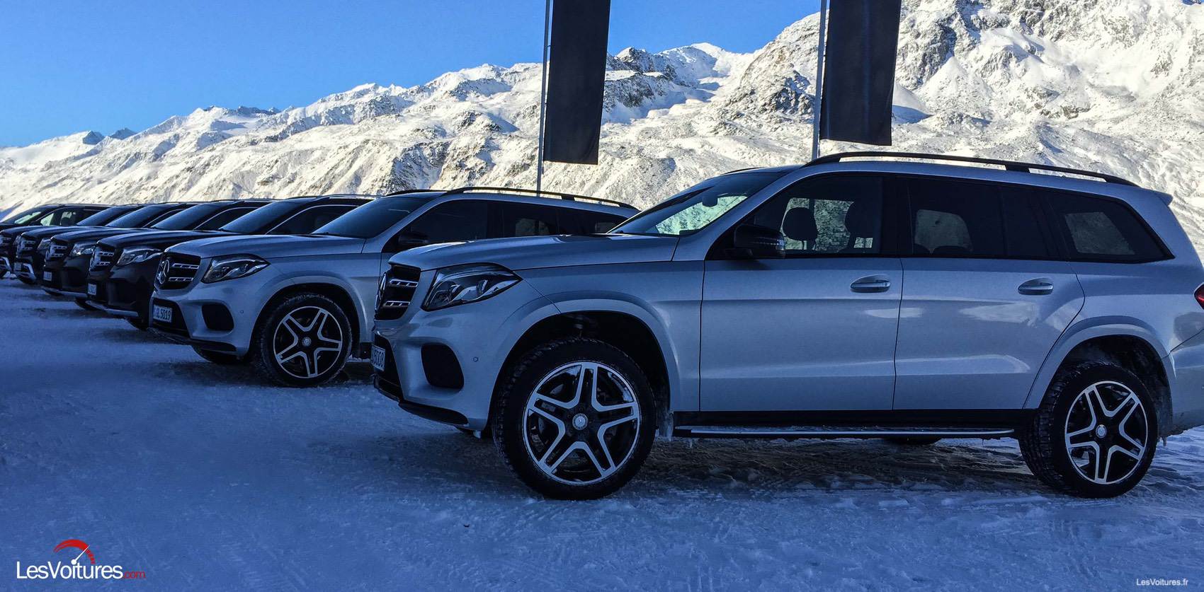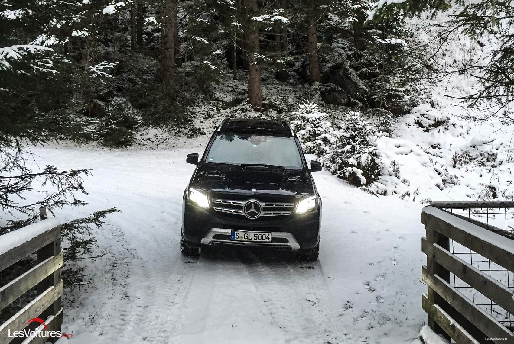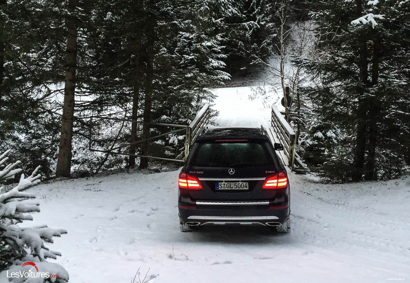 Du côté technologique, quelques éléments nouveaux apparaissent également. Le nouveau GLS se base sur la plateforme du GLE, à laquelle on a rajouté de la longeur. Une nouvelle boîte de vitesses automatique à 9 rapports fait également son apparition. Notre GLS d’essai était par ailleurs doté des suspensions pneumatiques AIRMATIC et d’un amortissement piloté. Mû par un V8 biturbo de 4.7 l de cylindrée développant 455 chevaux et 700 Nm de couple, le GLS accomplit l’exercice du 0 à 100 km/h en 5,3 secondes. Un réel exploit, quand on jette un œil à la masse de l’engin qui dépasse les… 2,5 tonnes ! Cet exploit a, vous le devinez, une contrepartie : la bête a soif, et sirote allègrement ses 12 l/100 km en moyenne, no comment… La tenue de route est exemplaire, le GLS est rigoureux en ligne droite comme dans les courbes, et semble se conduire comme un break dont le centre de gravité est pourtant bien plus bas ! « En mode Sport, les performances du GLS sont époustouflantes. Le moteur lui confère des accélérations de coupé sportif, tandis que les suspensions qui s’adaptent en temps réel aux aspérités de la route contiennent le roulis au quasi néant ! » nous confie Laurent Pasquali, notre pilote essayeur. Notons que notre essai a eu lieu également sur route enneigée, un autre terrain de jeu idéal pour le GLS. « La motricité est excellente même sur route enneigée. Le système 4MATIC fait un travail fabuleux, et la souplesse de la boite 9 est idéale dans ces conditions de conduite. » note Laurent.