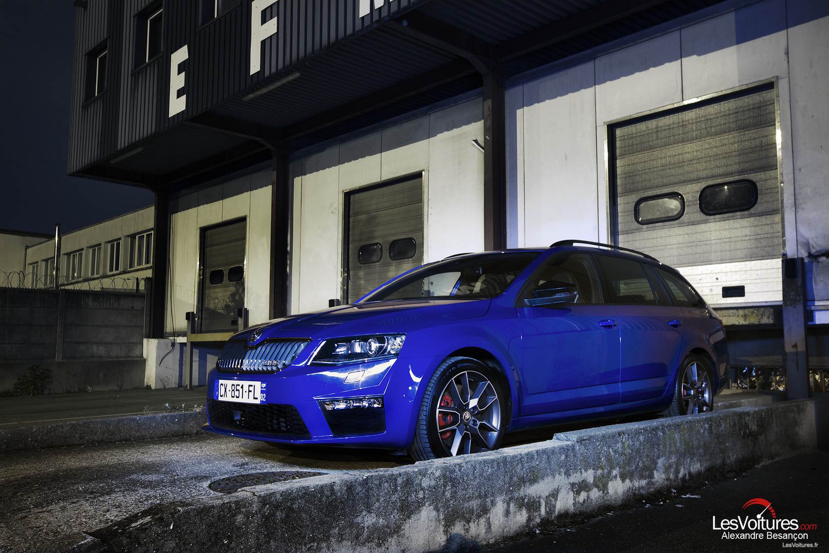 Le style extérieur est enfin séduisant, avec des lignes tendues et modernes, sublimées par la teinte « Bleu Racing » de notre modèle d’essai. Les phares avant à fond noir et les feux arrières à LED formant la lettre C donnent un coup de jeune à l’Octavia. La version RS offre de grandes jantes bicolores et quelques touches de sportivité bien senties et discrètes, telles que les deux sorties d’échappement ou les superbes baquets Recaro mi-cuir. Puisque nous sommes à l’intérieur, profitons-en pour citer les décorations type fibre de carbone et la présentation moderne. Le rétro-éclairage vert des boutons (couleur de la marque) est original et permet d’égayer l’intérieur de nuit.