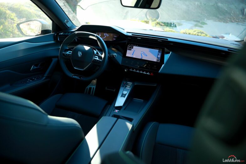 À bord, même constat : planche de bord, volant compact, sièges et i-Cockpit ont été conservés. Ce dernier se compose de série de deux écrans de 10 pouces, un combiné numérique 3D derrière le volant et un écran central tactile légèrement incliné vers le conducteur, compatible Android Auto et Apple CarPlay sans fil. Les i-Toggles numériques permettent de créer jusqu’à 5 raccourcis personnalisés.