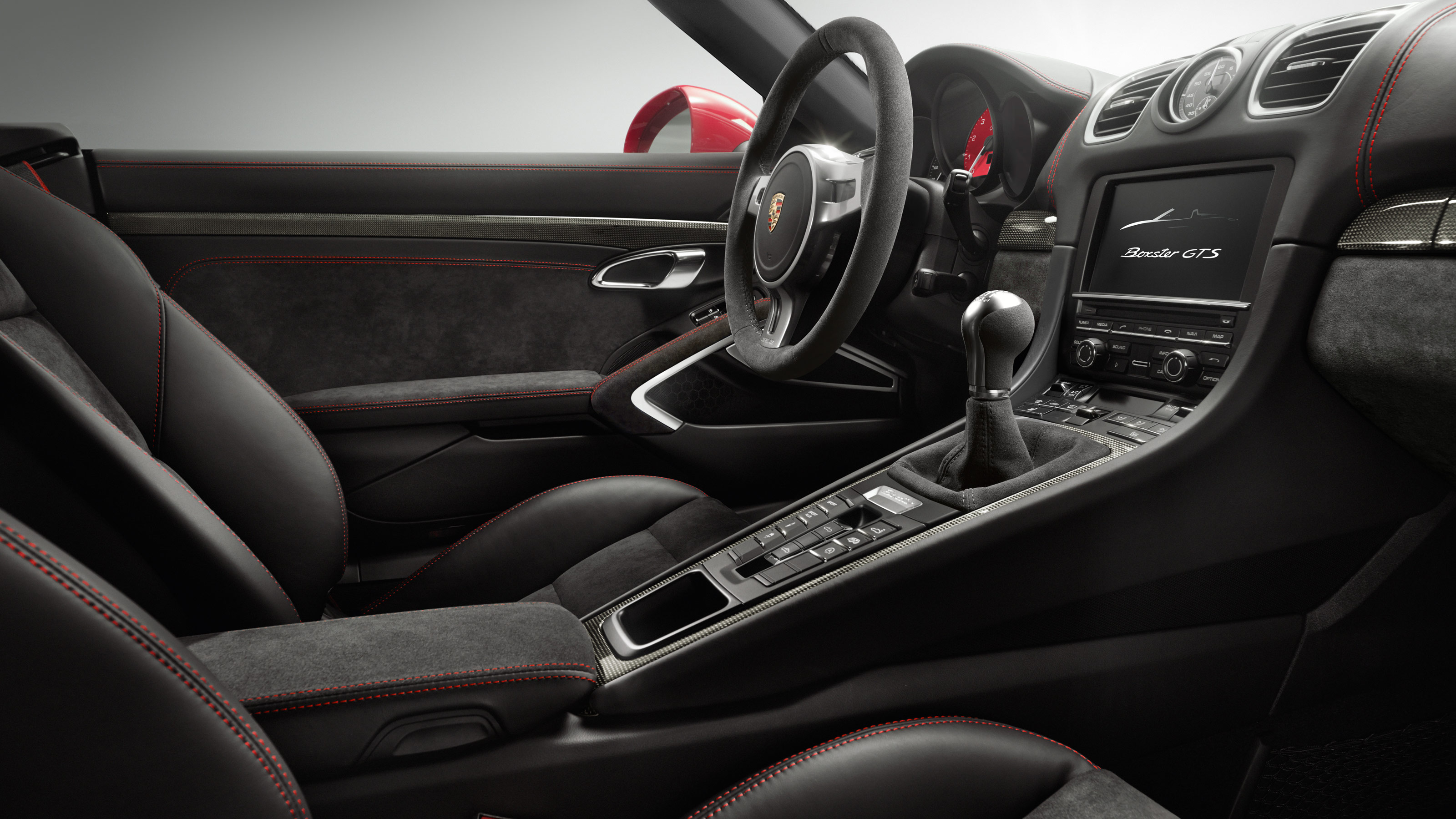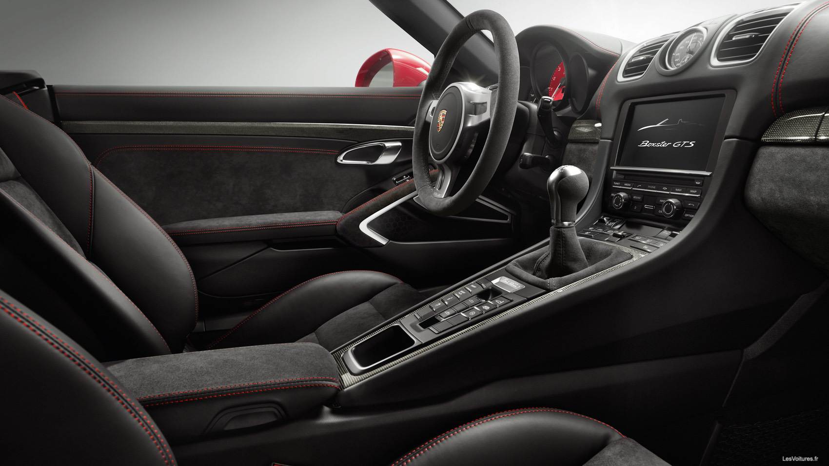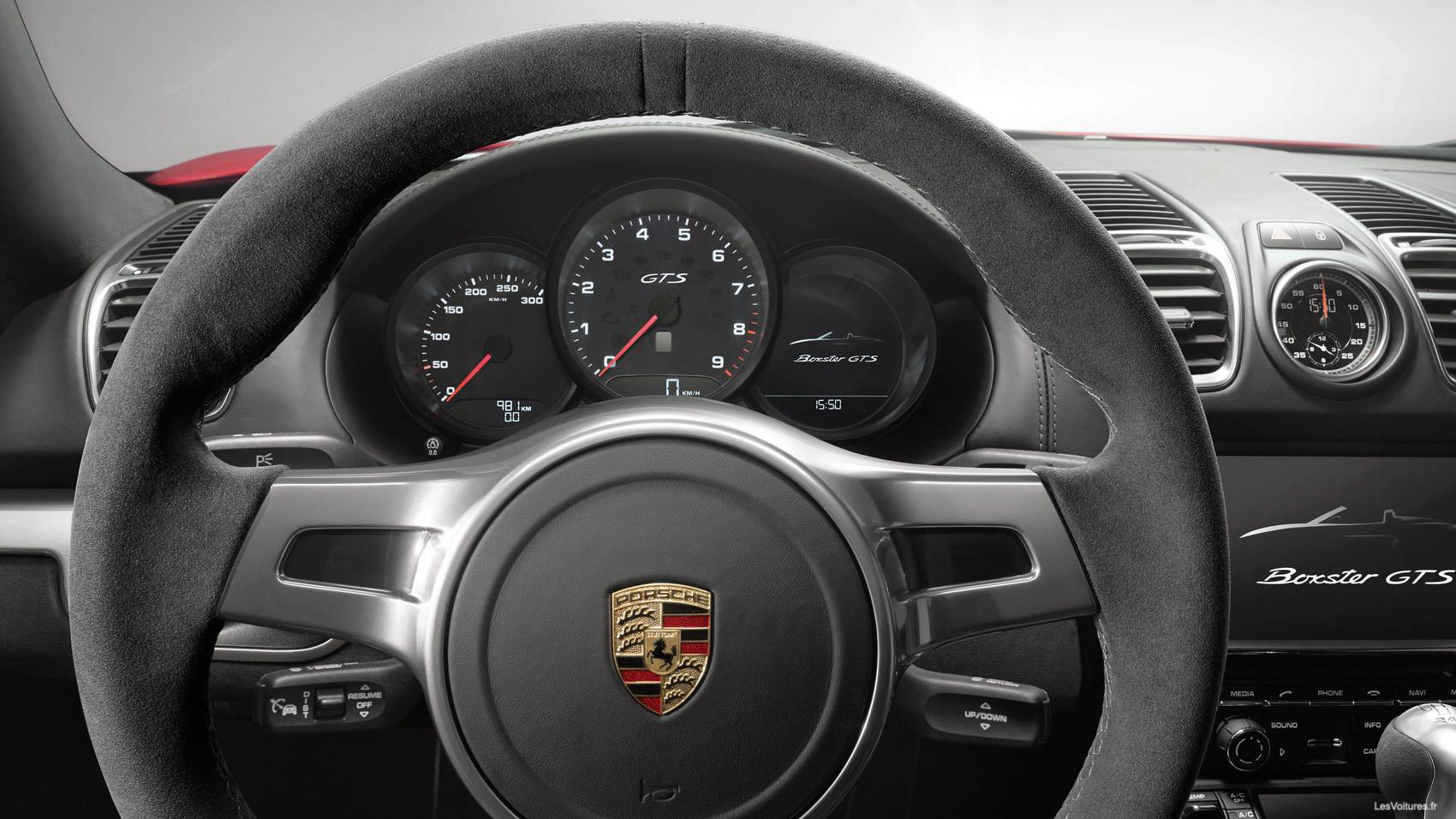 « L’intérieur est à la hauteur de la réputation Porsche : un exemple parfait de finitions irréprochables. Notre Boxster GTS possédait un intérieur soigné, agrémenté de surpiqûres rouges, renforçant le côté sportif du modèle. Un vrai plaisir pour les yeux. » nous confie Laurent. Les sièges baquets Sports, noirs avec des inserts d’Alcantara, vous maintiennent parfaitement au ras du sol. Le volant 3 branches spécifique et le pommeau de la boîte de vitesses ont été revus avec soin, et font leur effet. Les trois compteurs ronds qui se trouvent juste derrière le volant restent fidèles à la tradition Boxster. Le conducteur et le passager jouissent en outre d’un bel espace grâce aux dimensions de l’auto, chose appréciable pour un roadster. Dans ce Boxster GTS, tout nous invite à mettre le contact, à gauche, bien entendu et à nous laisser emporter par les envies et les émotions suscitées par la première rencontre. Moteur !