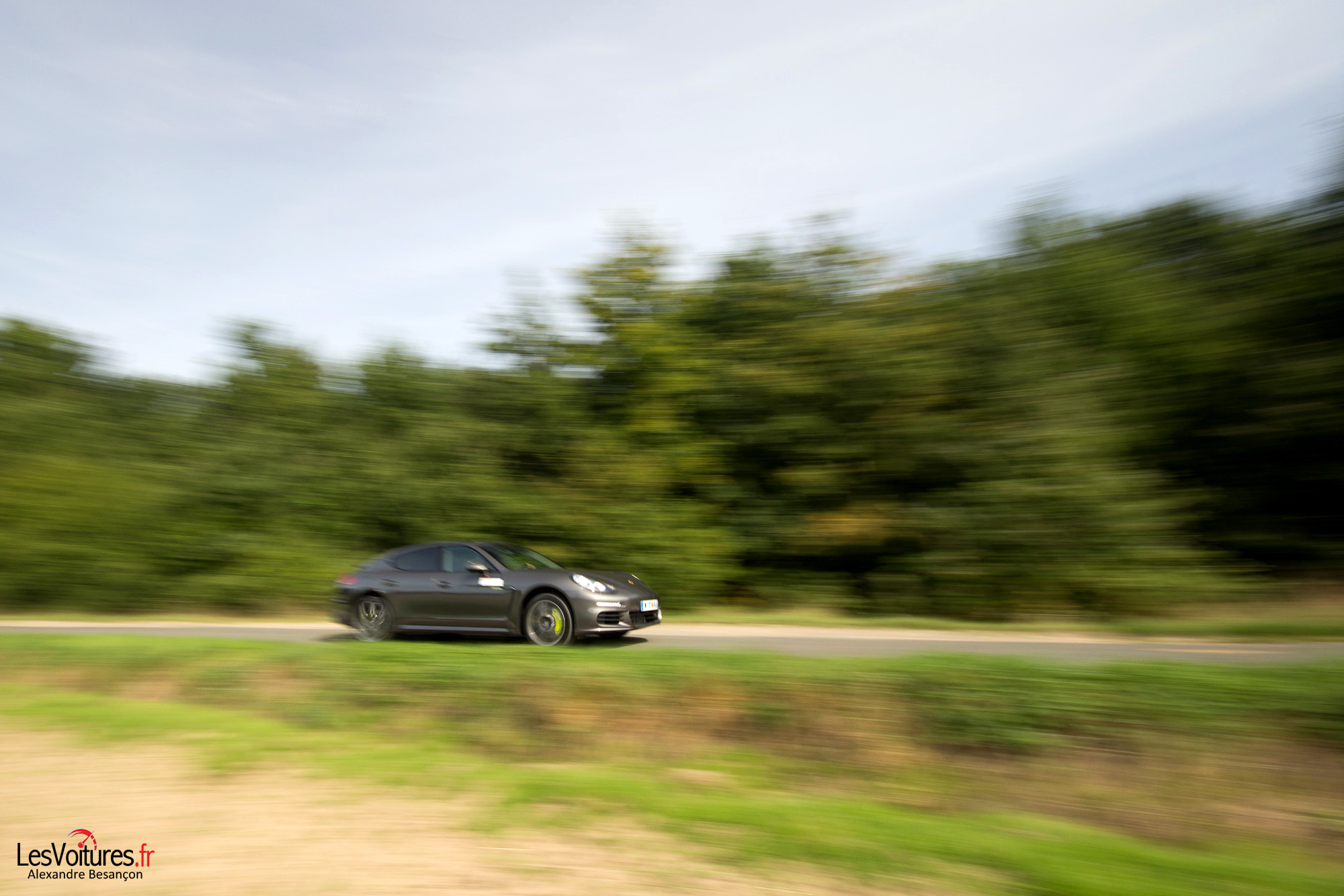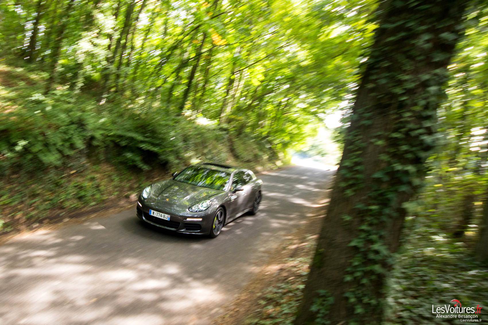 Notre essai se poursuit sur les routes boisées de l’Essonne. Que vaut la Panamera S E-Hybrid et ses 2095 kilos (DIN) en mode Sport ? Notre Power-Meter dans le rouge « E-Boost », la Panamera utilise alors ses deux sources d’énergie. A jamais opposés, l’essence et l’électricité se marient alors pour le plus grand plaisir de Laurent : « Le comportement de la Panamera est toujours aussi exceptionnel avec la technologie en plus, j’adore le petit grondement qui résonne à l’intérieur de l’auto et qui nous rappelle que nous sommes bien au volant d’une Porsche. » En effet, il faut avouer que la Panamera S E-Hyprid est hyper silencieuse, Porsche fait du silence une de ses priorités avec la S-E Hybrid, l’option échappement Sport n’étant pas disponible. Il flotte alors une atmosphère de légèreté dans l’habitacle, la grande berline s’arrache au bitume avec une facilité orgueilleuse grâce à son couple de 440Nm, toutes les Porsche sont des Sportives… La Panamera abat ainsi le 0 à 100 km/h en 5,5 secondes, sa vitesse maximale étant de 270 km/h. Equipée en série des systèmes « Active Suspension Management (PASM) », « Suspension pneumatique adaptative » et de la direction assistée « Servotronic Plus », la Panamera se joue des virages.
