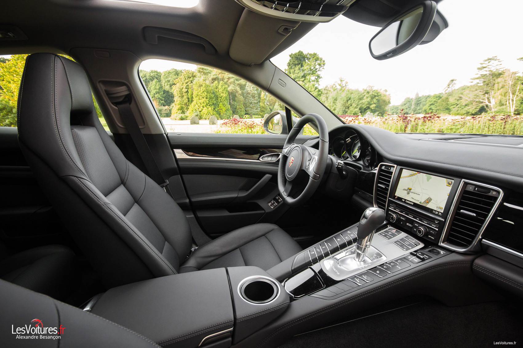 Avant de débuter l’essai et d’expérimenter sur route la technologie hybride, rappelons que la Porsche Panamera a été redessinée au printemps dernier. A l’avant le bouclier a été revu et dispose de nouvelles prises d’air élargies. Les barres de diodes ont été affinées et déplacées. Sur la Panamera 2013 elles sont intégrées au sein même du bouclier sous les feux qui bénéficient d’un nouveau style, coupés en biseau. A l’arrière, la jupe longiligne a disparu au profit de traits plus courbes et sportifs. Comme pour l’avant les feux arrière sont nouveaux. Résultat de ce travail du bureau de style Porsche : la Panamera perd son aspect « mastodonte » et gagne en dynamisme et se rapproche un peu plus des traits de la 911. D’ailleurs, notre modèle d’essai de couleur Gris Quartz arbore les superbes jantes 911 Turbo II de 20 pouces (option).