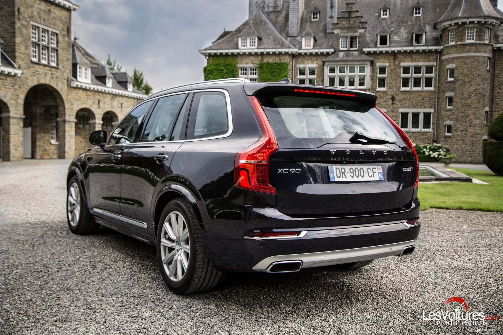 Heureusement, l’arrière du nouveau XC90 rappelle fortement la parenté avec son prédécesseur qui avait quand même bénéficié d’un facelift en 2006. La cassure du haut des ailes arrière et les grands feux verticaux sont toujours présents mais tout a cependant été affiné et modernisé. Exit, la marche du pare-chocs arrière et place à deux sorties d’échappement horizontales par exemple. Le rendu global du XC90 est de toute beauté et sa silhouette ressort magnifiquement dans notre majestueux décor naturel de la forêt des Ardennes, au Manoir de Lébioles.