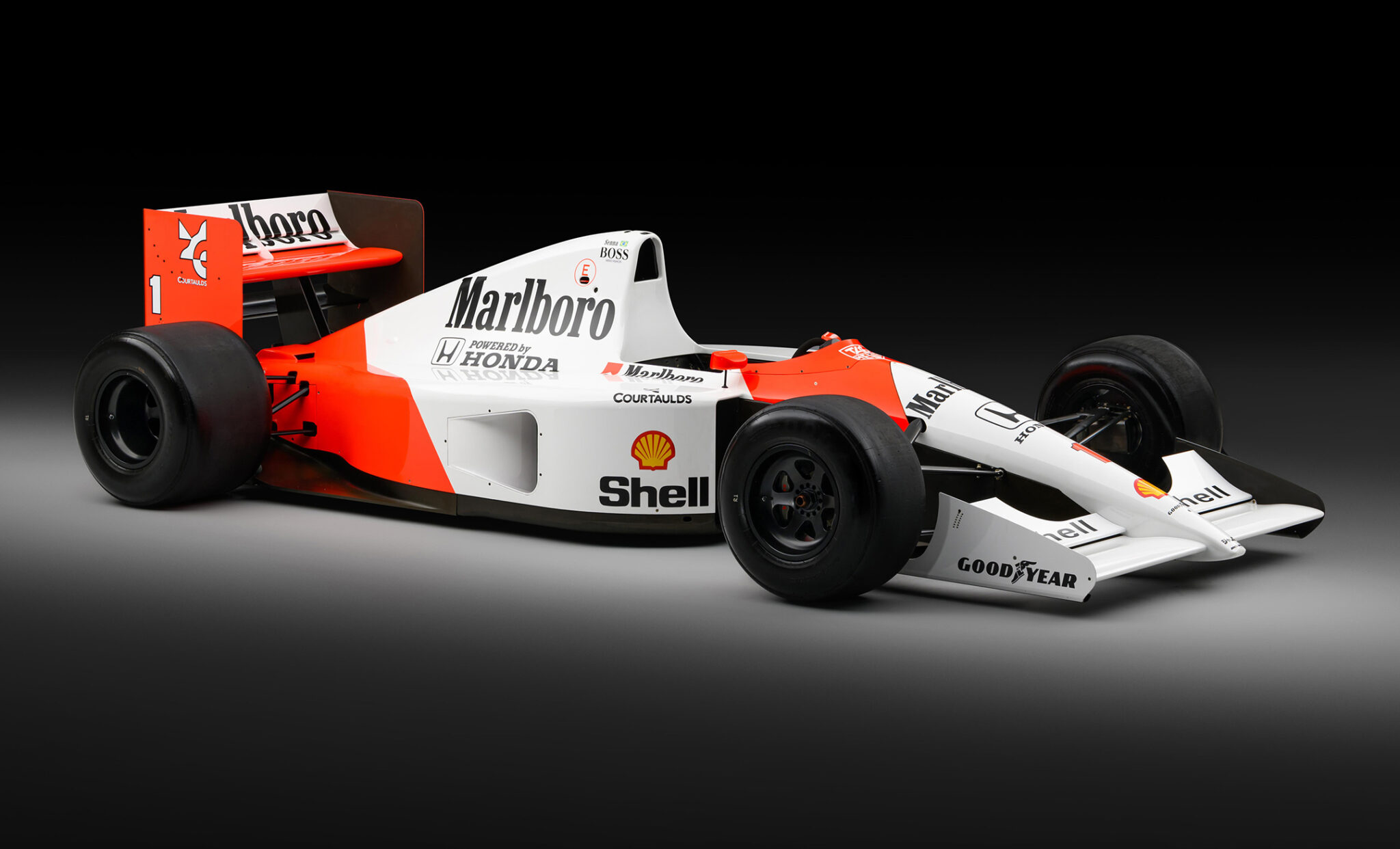 Techniquement, la MP4/6 représentait l’avant-garde de son époque. Conçue par Neil Oatley sous la supervision de Gordon Murray, elle était propulsée par un moteur V12 Honda de 3.5 l, capable de délivrer 720 ch et de grimper jusqu’à 13 800 tr/min. Associée à une boîte manuelle à six vitesses, cette mécanique était intégrée dans un châssis monocoque en fibre de carbone, une architecture qui marquait déjà la transition vers la modernité.