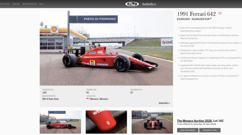 Pour tout savoir sur cette Ferrari 642 (châssis 125), cliquez sur l’image situé ci-dessous pour accéder à l’annonce publiée par RM Sotheby’s. Vous y trouverez toutes les infos et d’autres photos de cette monoplace rouge. Cette dernière sera donc mise en vente, aux enchères, à Monaco le 25 avril 2026.