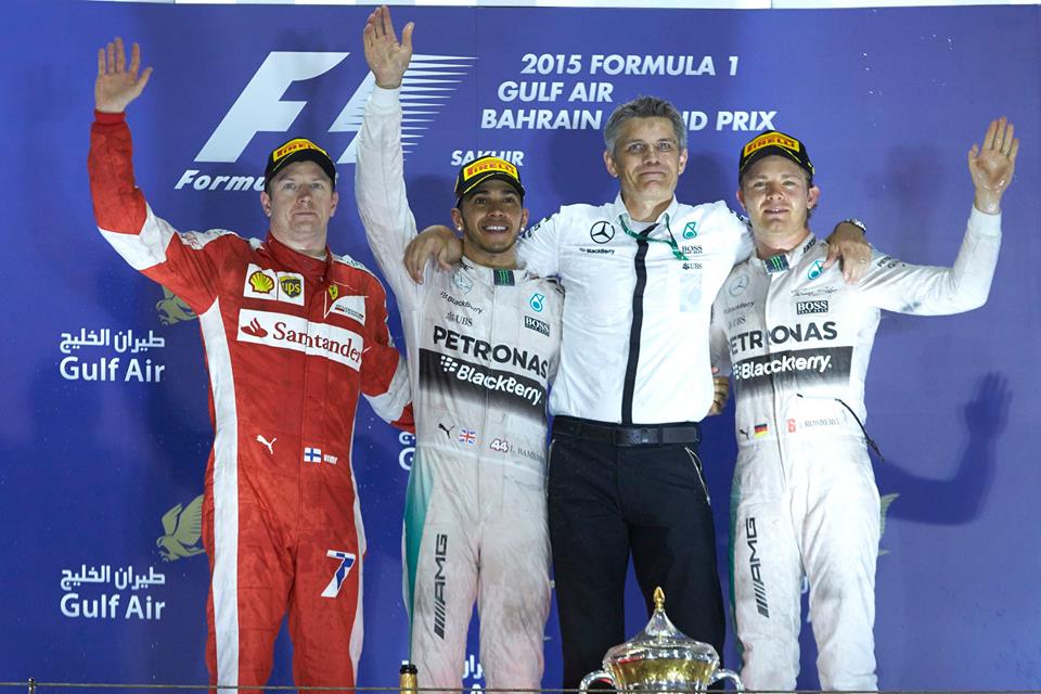 Vainqueur aujourd »hui à Bahreïn, Hamilton a observé dans ses rétroviseurs la lutte entre les deux Ferrari de Vettel et Räikkonen et la Mercedes de son coéquipier. Le premier grand perdant de ce duel à trois a été Vettel. Après être sorti trop large à l’entrée de la ligne droite lors du 35ème tour, le pilote allemand est contraint de repasser par son stand deux tours plus tard pour changer d’aileron avant. Räikkonen est ensuite revenu rapidement sur Rosberg. Ce dernier commet une erreur à deux tours de l’arrivée. Il n’en fallait pas plus au finlandais pour s’emparer de la 2ème place.