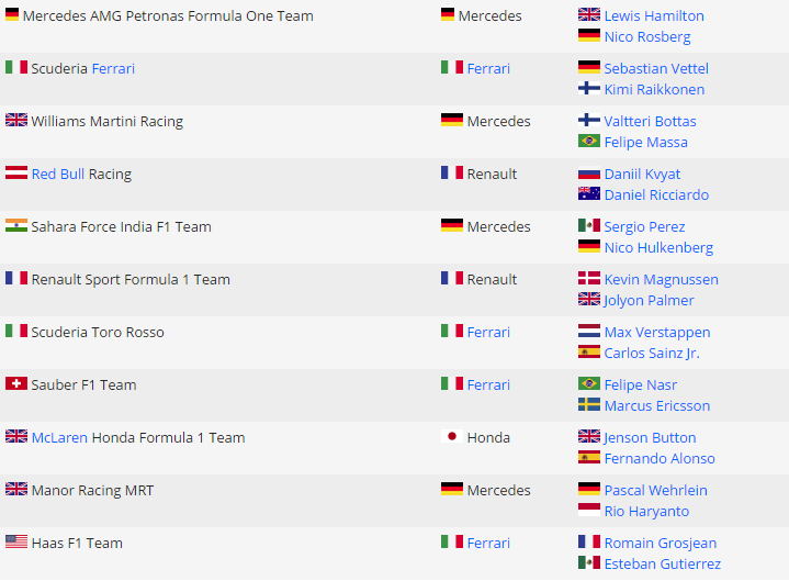 Trois nouveaux visages débarquent cette année : Jolyon Palmer, Pascal Wehrlein et Rio Haryanto. Au niveau des équipes, les deux nouveautés sont représentées par le Renault Sport Formula 1 Team et le Haas F1 Team.