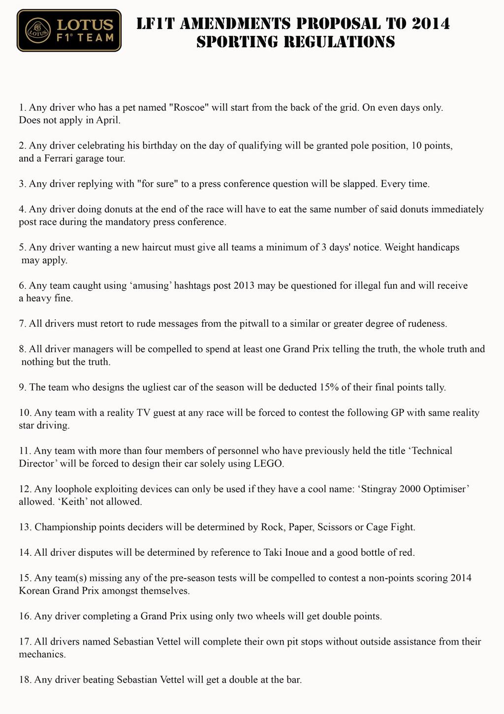 Voilà une communication qui va faire le Buzz ces prochains jours. En F1 « moderne », il est bien rare de voir un tel communiqué ! En réaction aux nouvelle règles instaurées par la FIA en 2014, Lotus F1 Team vient de publier son propre réglement « 100% humour » ! Choisissez votre règle préférée, l’original en V.O est à retrouver à la fin de cet article.